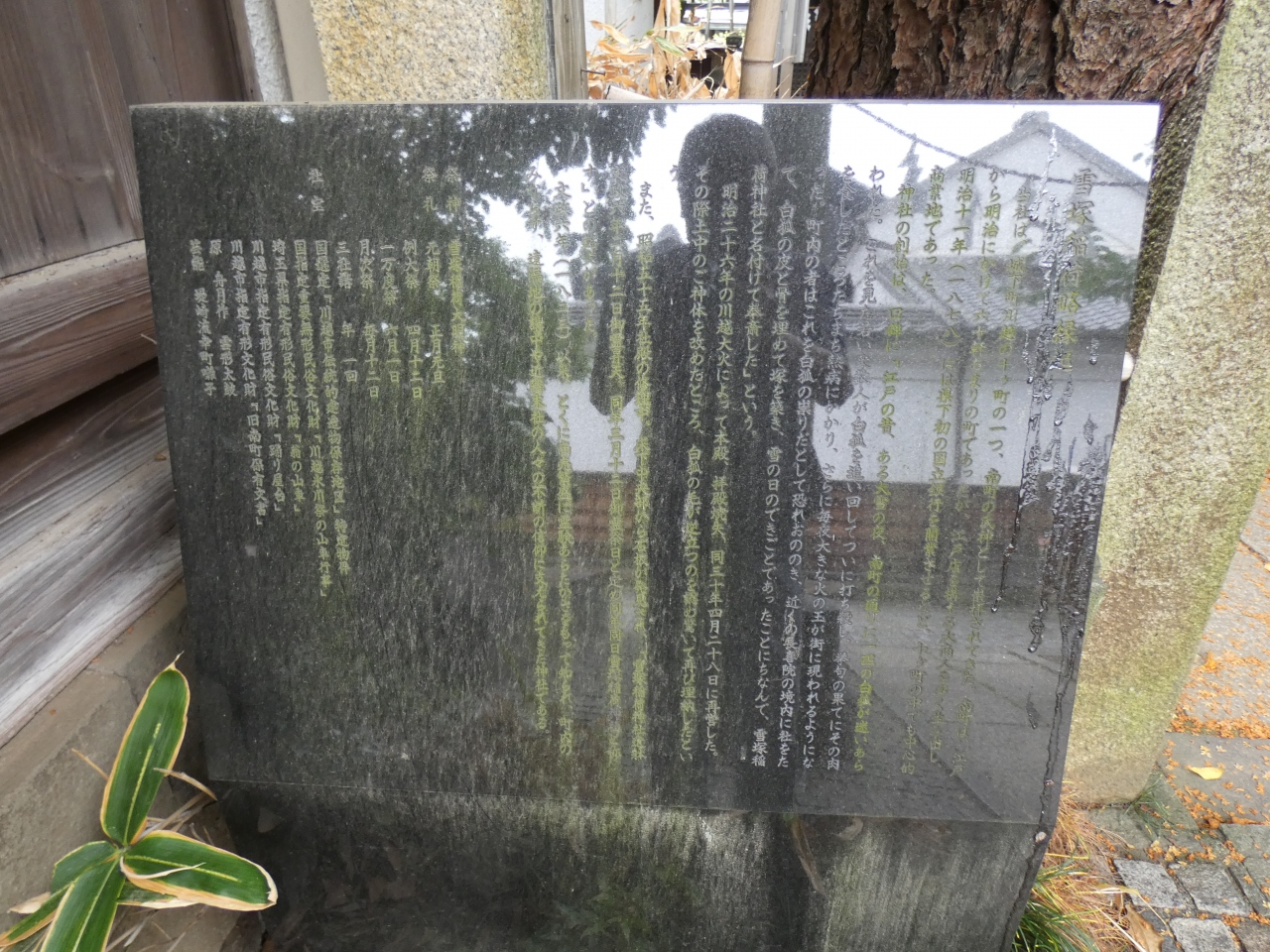 蔵造りの町並みの幸町の西側、長喜院山門前に鎮座する小さな神社。文政6年(1823)に起きた町民による白狐打殺し事件に端を発し、その祟りを鎮める為に建てられた社だそうです。雪塚稲荷神社は創建以来、商売繫盛に霊験があるとされ、町内だけでなく遠隔地からも信仰を集めていたようです。