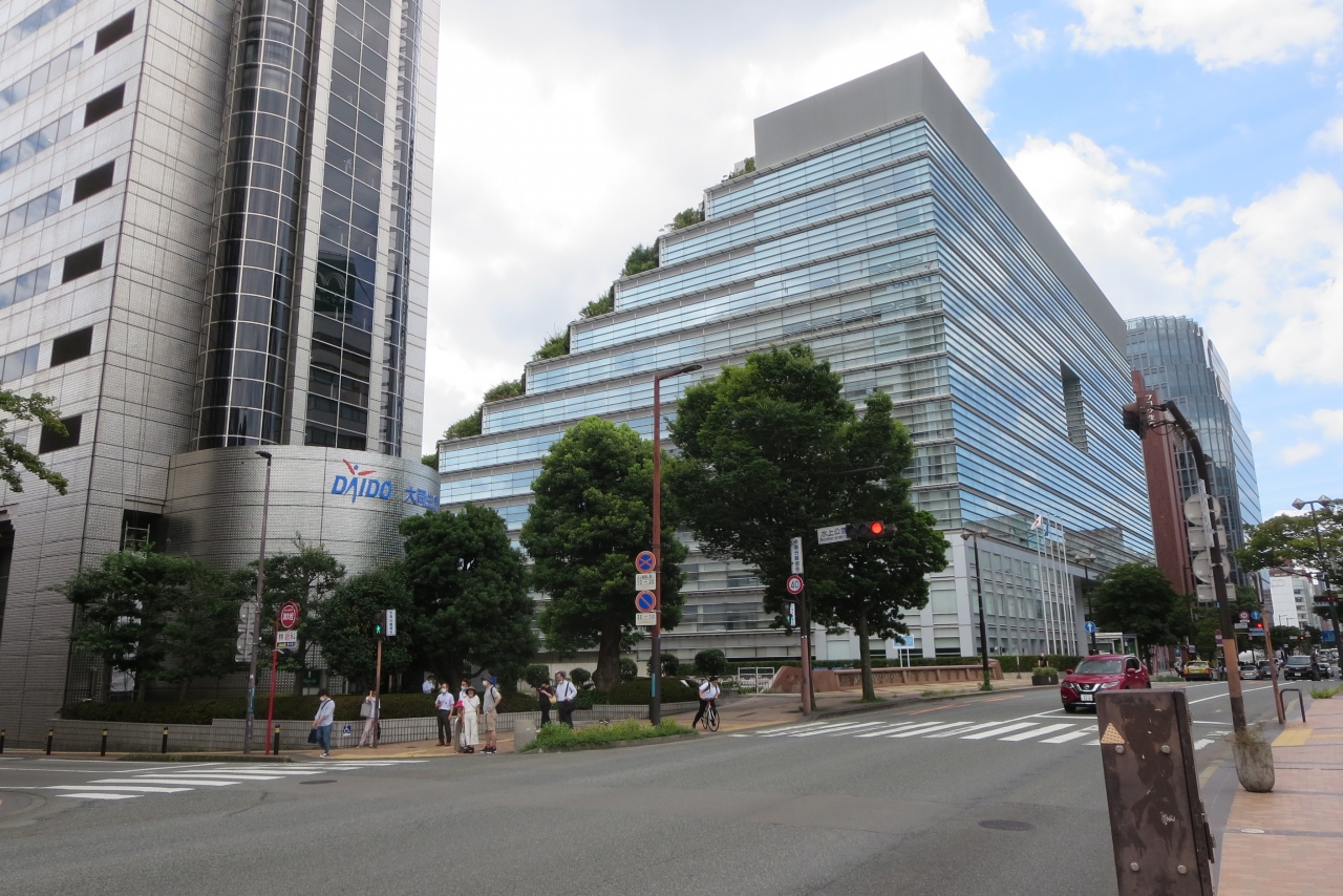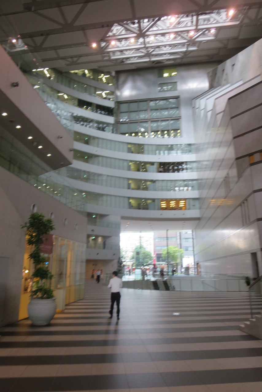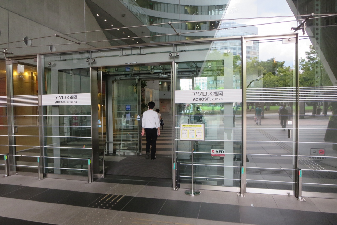 旧福岡県庁跡地の敷地約3万m2に建設された複合施設のビルです。敷地内の南側には天神中央公園があります。この建物は南側に特徴があります。壁面が階段状になっていて、そこには植栽が施されています。天神中央公園と一体化して、緑の空間を作っています。また南側を緑化することで省エネにも役立っています。自然と共生し、心潤う空間づくりがテーマだそうですが、まさにその通りです。内部1階は吹き抜けの大空間があります。また福岡シンフォニーホール、国際会議場パスポートセンターなどを備えて多目的に利用できる複合施設です。天神地下街にも地下通路で連絡していますので雨が降っても傘なしで天神に行けます。