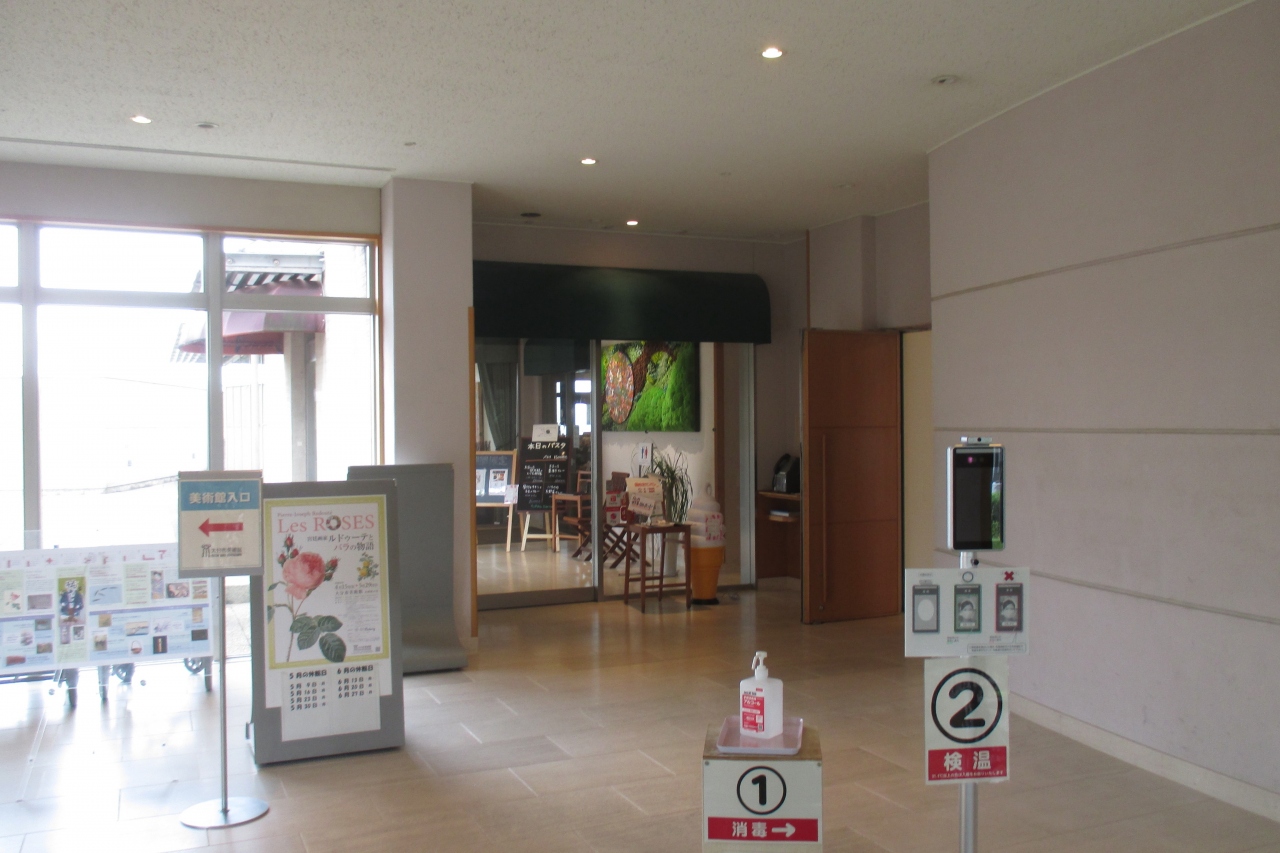 いろのわは美術館と廊下で繋がっていました。店名のサブタイトル?として、Art Tableと書かれていて、何かなと思いました。これは市内の若い作家さんの作品が店内に展示されているからだそうです。どういう基準となっているのか分かりませんが、発表する機会は限られているでしょうから、励みにはなるのでしょうね。地元野菜の直販もやってました。これも地元応援でしょうね。
