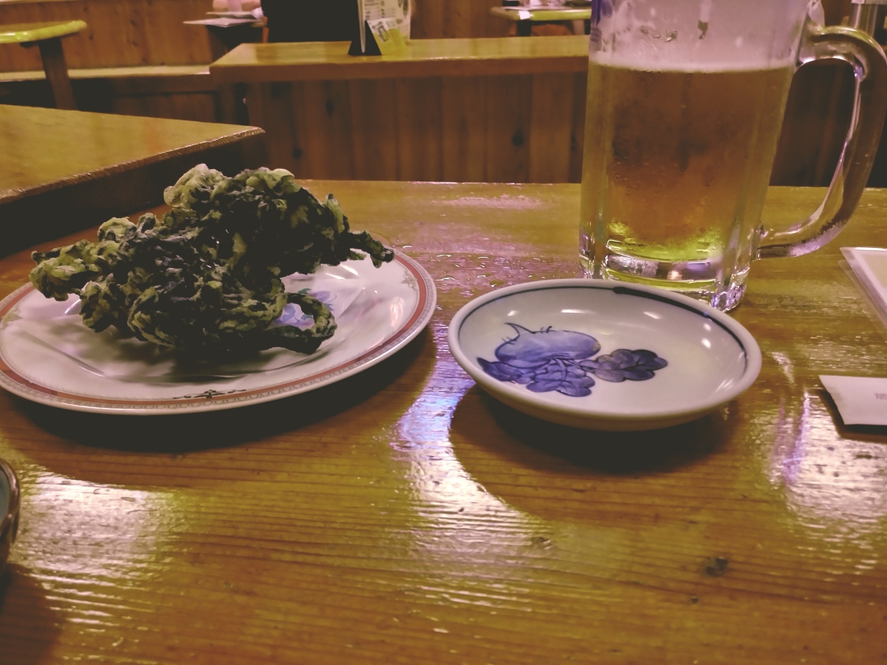 - 天ぷらはサクサクでビールが進む。