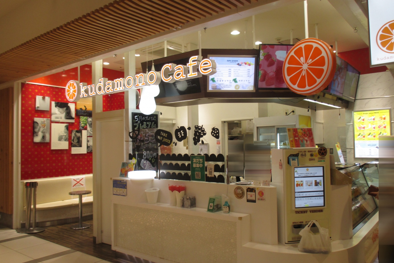 くだものかふぇは豊後にわさき市場の中にありました。カットフルーツが入ったカップがずら~っと並んでいて、カラフルなウィンドウに目を奪われます。これをジュースにするのですが、このままフォークで突いても良さそうに感じました。それはさておき、手書きの案内板を見ると、5月プレミアムいちごがありました。ちょっと値が張りますが、2人で1つとすれは普通の値段です。ここは頂いておきましょう。これは「あまおう」ですよね。