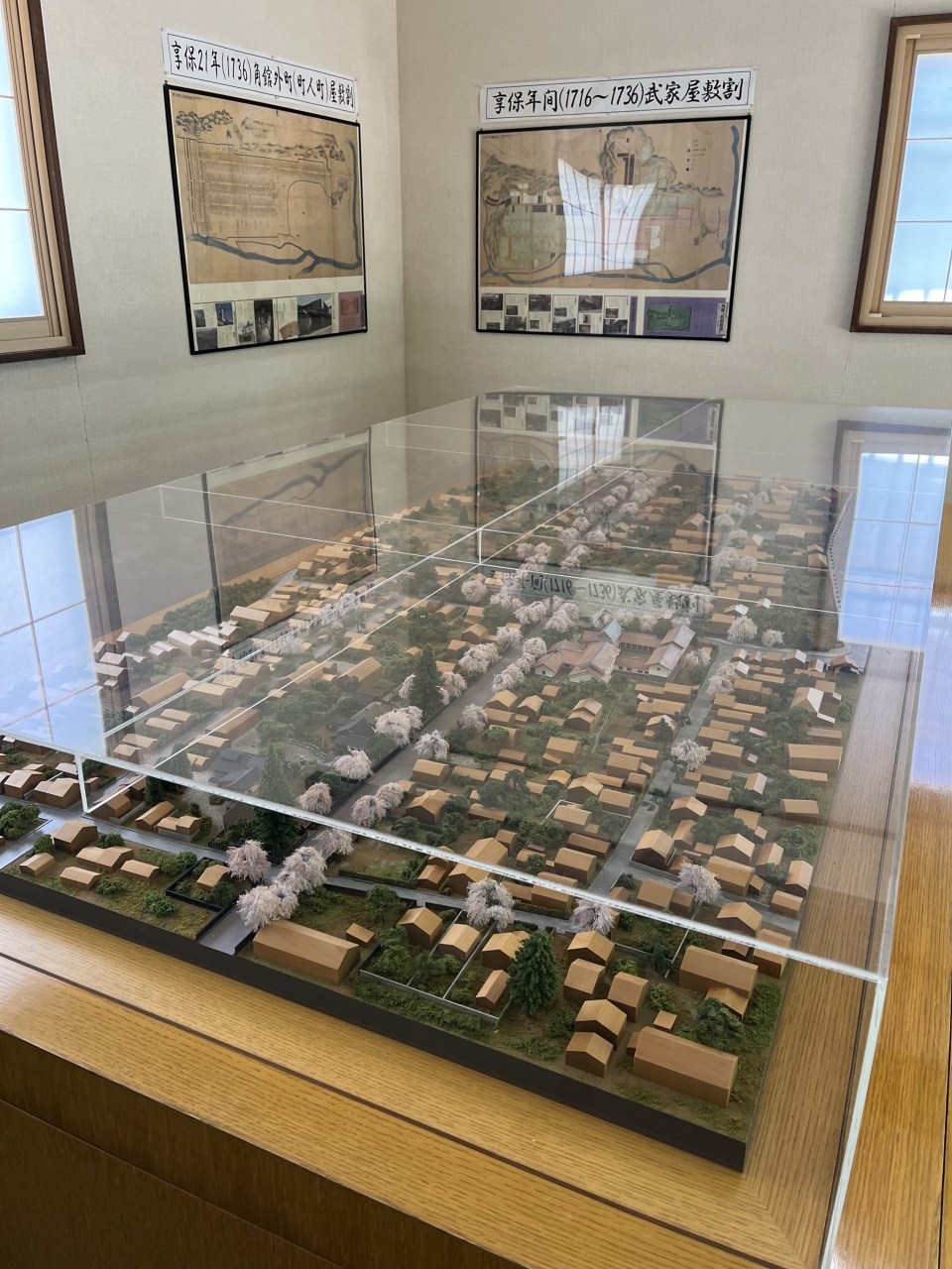 武家屋敷通りにある史料館です。こちらも古い建物で、見学できるのかと思って覗き込んだところ、「角館武家屋敷模型展示室」があったので立ち寄りました。角館武家屋敷の街並みが模型で再現されていて、自由に見学できるようになっていました。武家屋敷の全容がわかるほか、枝垂れ桜の見どころもわかりやすかったです。江戸時代の古地図も展示されていました。偶然立ち寄ったスポットでしたが、興味深いものを見られて良かったです。