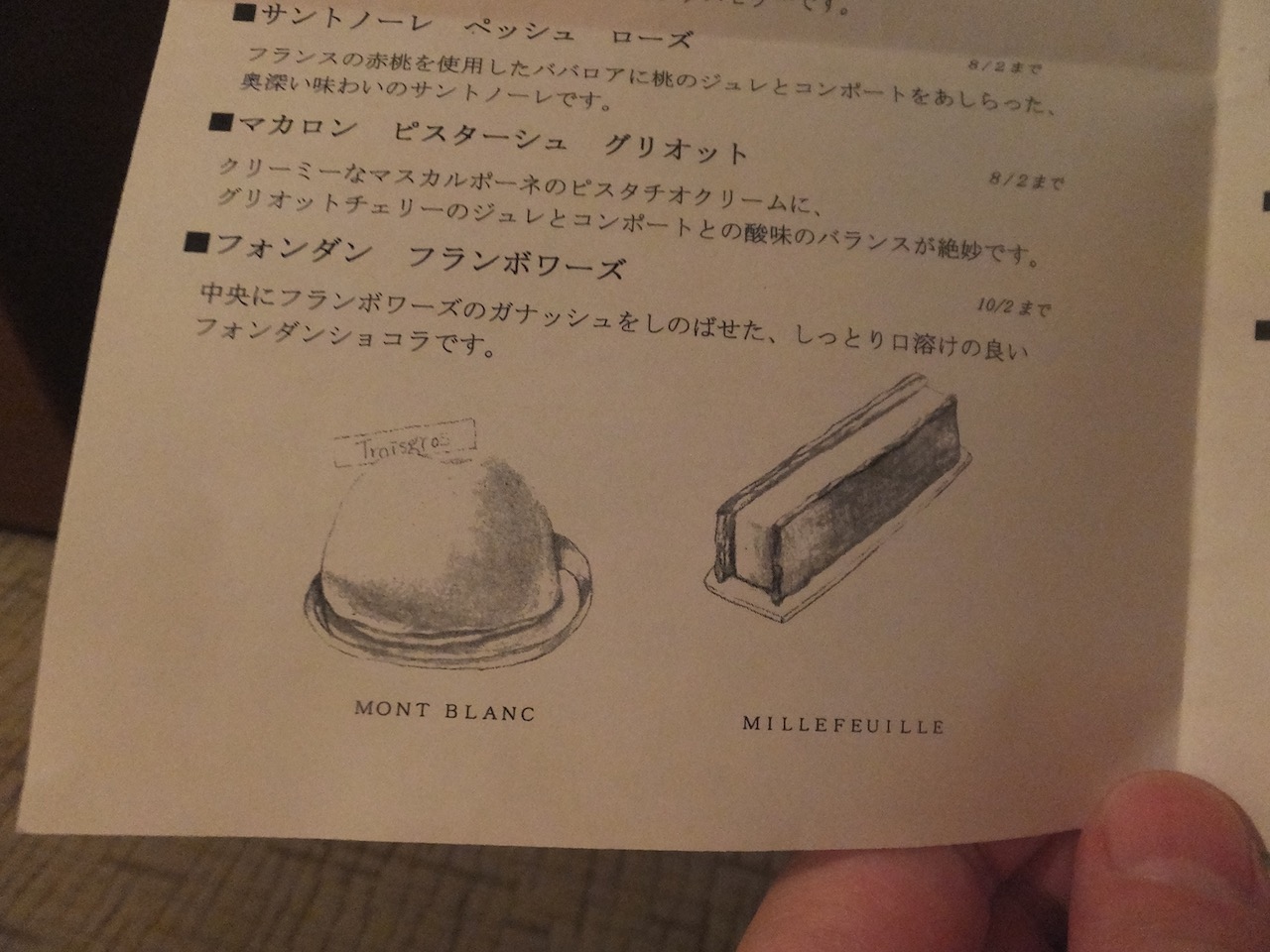 小田急百貨店の中で最高級ブランドのひとつ。ホテルでの夜のお菓子の購入です。ケーキは最近かなり値上げしてきた感じはありますが、ミルフィーユが美味しそうなのにまあまあ値段が抑え気味なので、気に入って購入。ふつうは何層かパイが重なっているものですが、両側だけ、だからかもしれません。フォークでサクッと切れる適度の硬さもよく、中のクリーム層が厚いのでケーキらしさがあるのもよく、お茶菓子として最高でした。