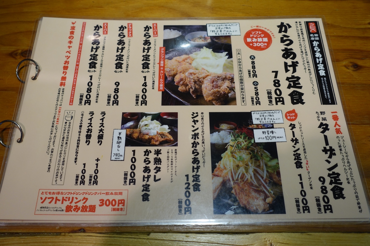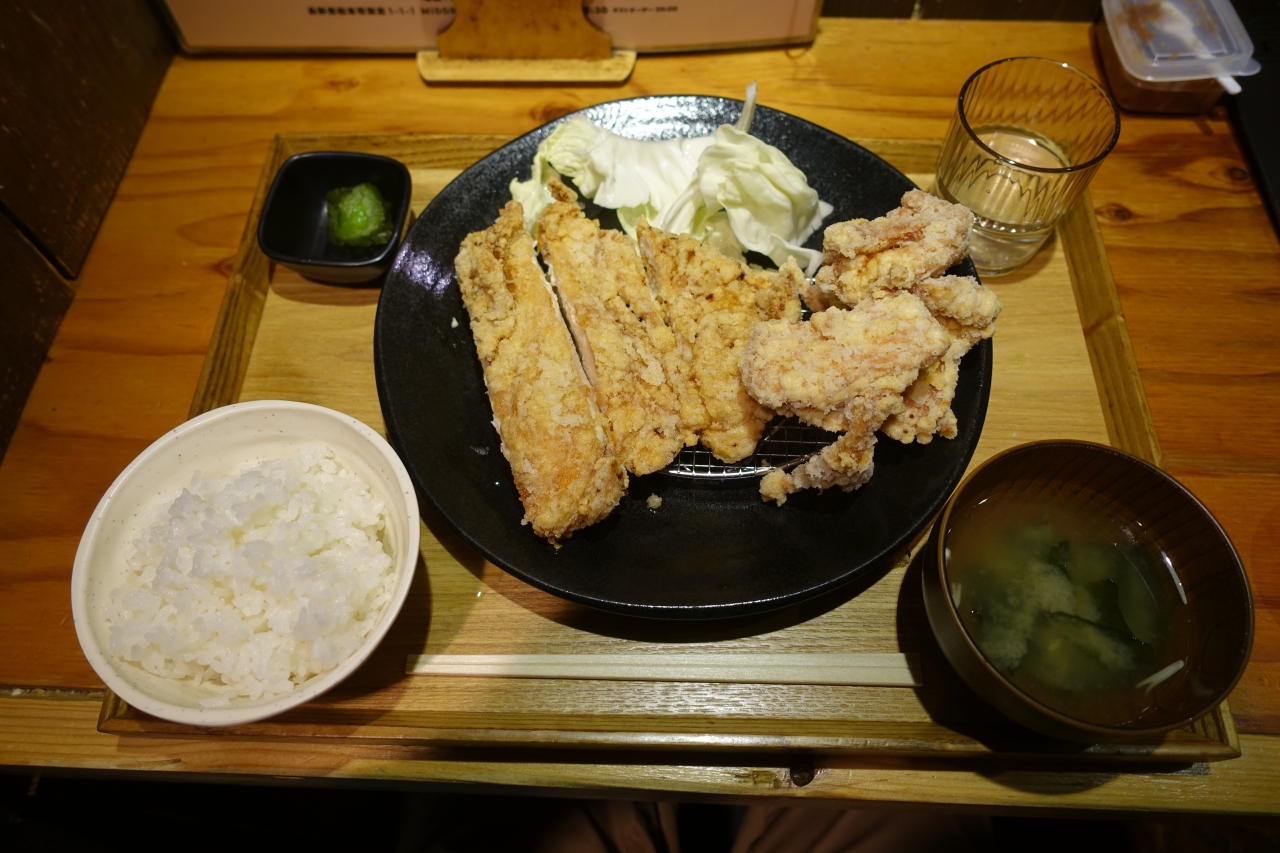 注文したのは山賊焼とからあげが半分ずつ両方食べられる山賊焼からあげ定食(税込1,058円)。山賊焼は衣はカリッと、そして肉は厚みが結構あるのにもかかわらずジューシーでやわらかくおいしいです。ボリュームがすごいのでガッツリ食べたい人向き。女性や小食の人は量に注意。ハーフサイズも用意されてますし、食べきれなかった分は持ち帰り用の袋をくれるとのことです。