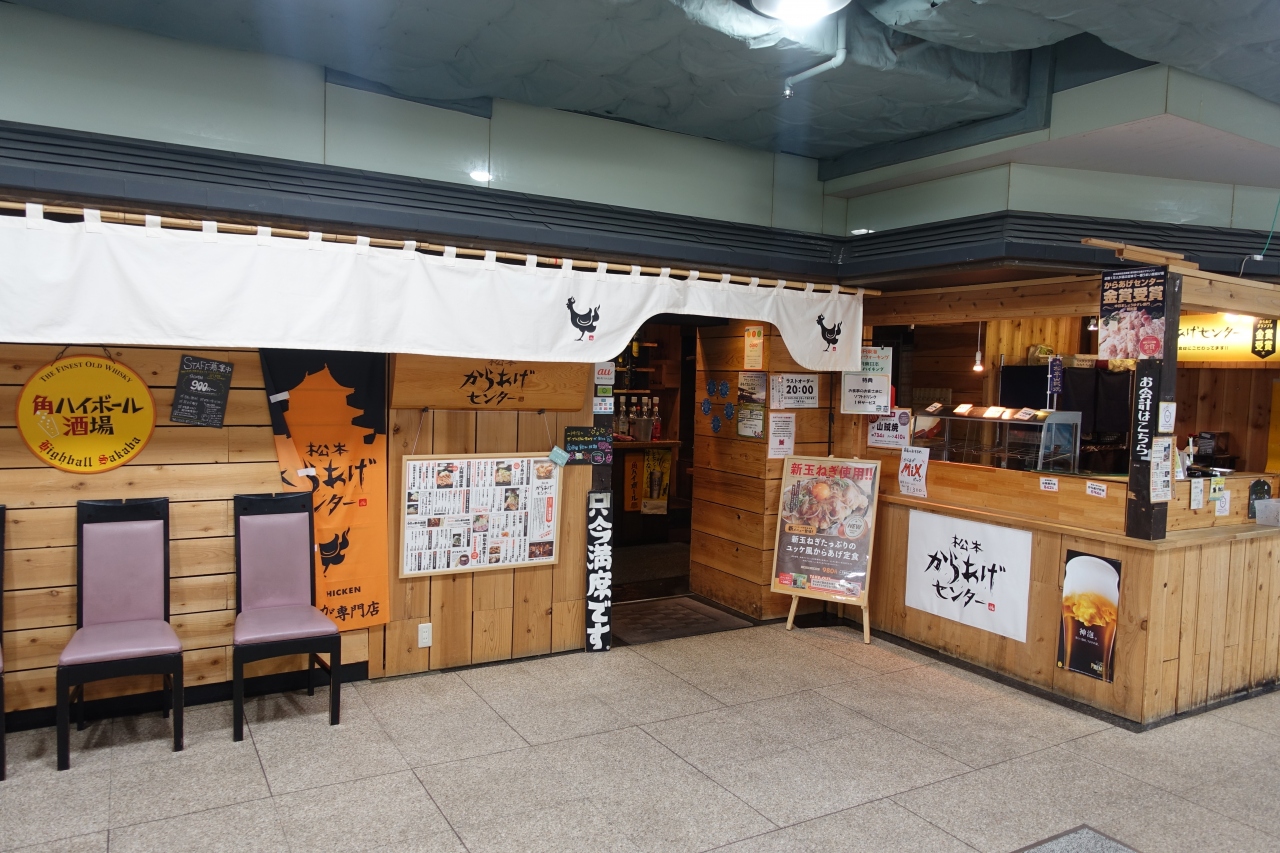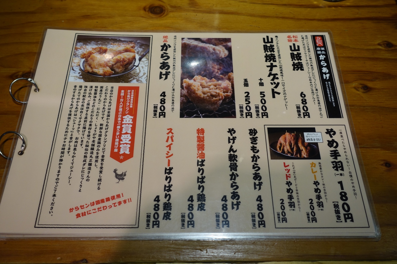 名物の山賊焼を食べに松本からあげセンターへ。駅ビルMIDORIの4階にあります。19時頃に行ったら満席で少しだけ待ちました。店内は居酒屋っぽい造り。自分は一人だったのでカウンター席に案内されましたけど、半個室風のテーブルもありました。
