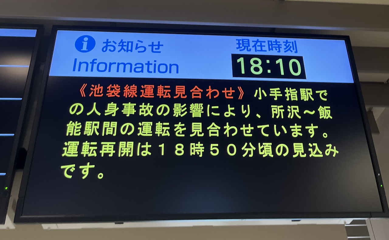 『小手指駅で人身事故の影響により 所沢〜飯能間の運転を見合わせ』とのこと…