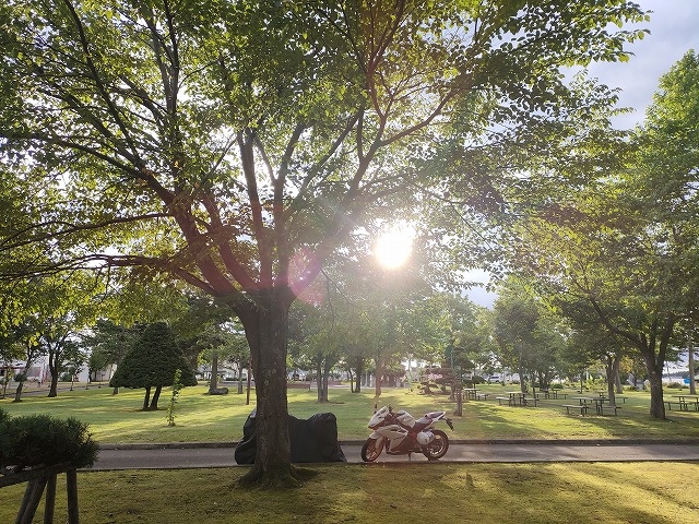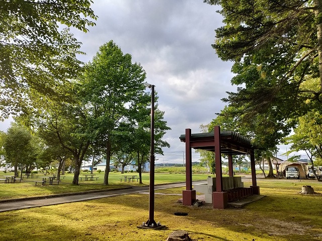 キャンプエリアは、道路側の公園入口から3、40m離れた奥の木陰の辺りで、テントを張れる場所は紐で囲われています。平時はあまり利用者を見かけませんが、夏場の週末や、特に沼田町で行われる夜高あんどん祭りの日などは、10~20人程度のキャンパーがいて賑やかでした。