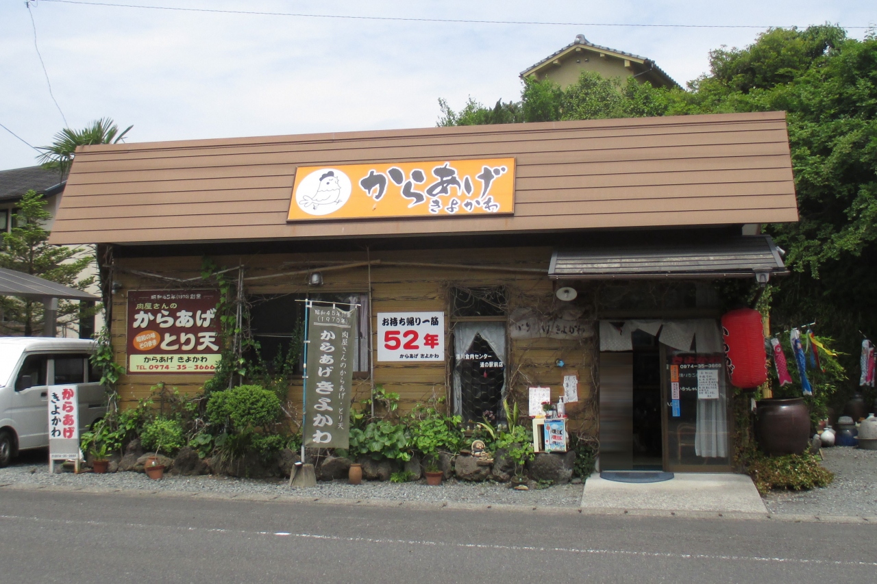 道の駅きよかわとは対面するところに、からあげ・きよかわがありました。コーヒーショップでもおかしくない外装ですが、表には「お持ち帰り一筋52年」と掲示されていて、幟には1970年(昭和45年)創業、肉屋さんの唐揚げ、とり天と書かれていました。もう半世紀以上頑張っているとありますが、道の駅きよかわには唐揚げを扱うお店はないのですね。毎年、看板を更新しないといけませんが、それも励みになっているのでしょう。