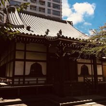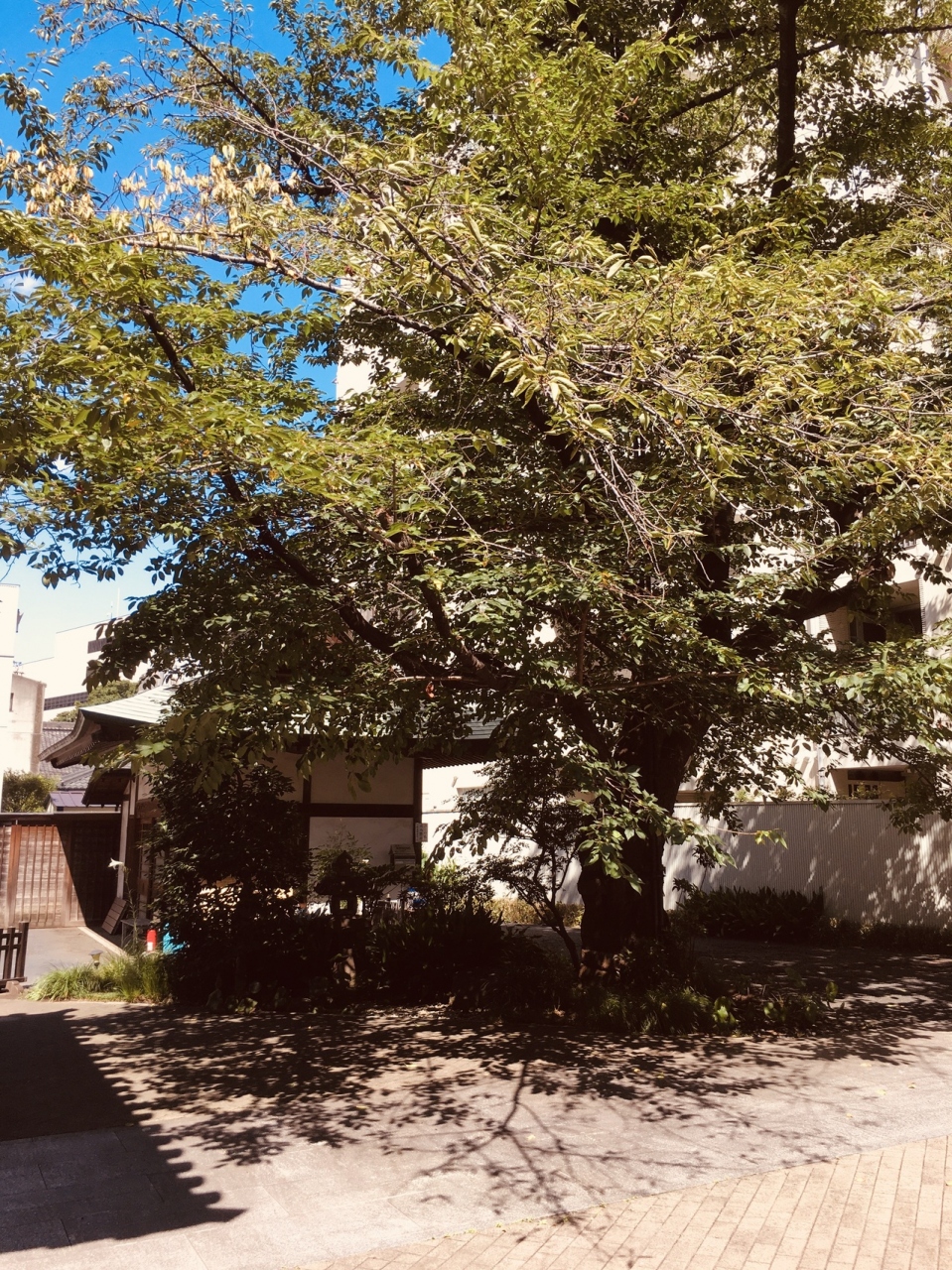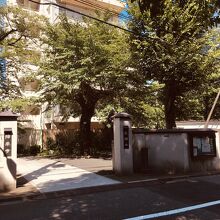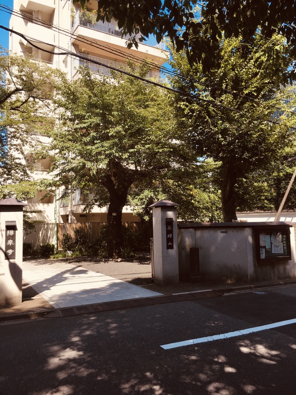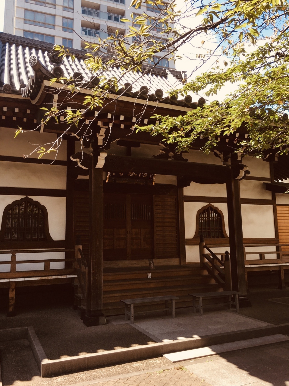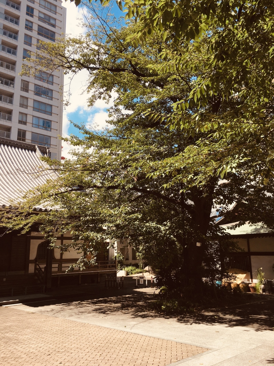 アメリカ大使館の裏側にあるひっそりとした寺でした。駐車場の横には大きな桜の木があって新緑が見事でした。舗装された境内で、本堂の裏手にお墓があります。後方には高いビルがありましたが、静かな穴場の場所でした。