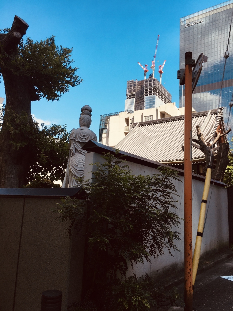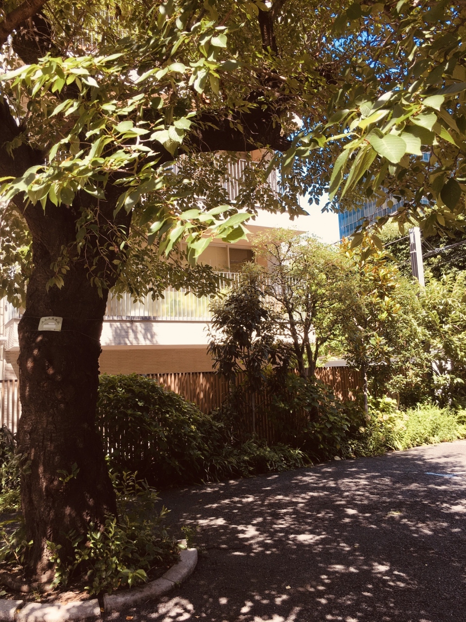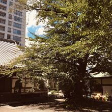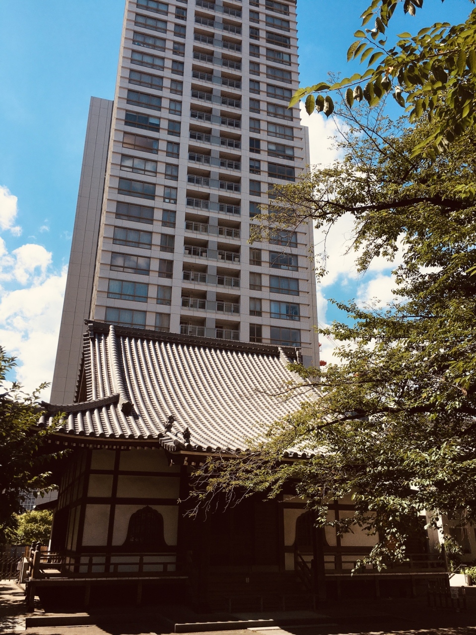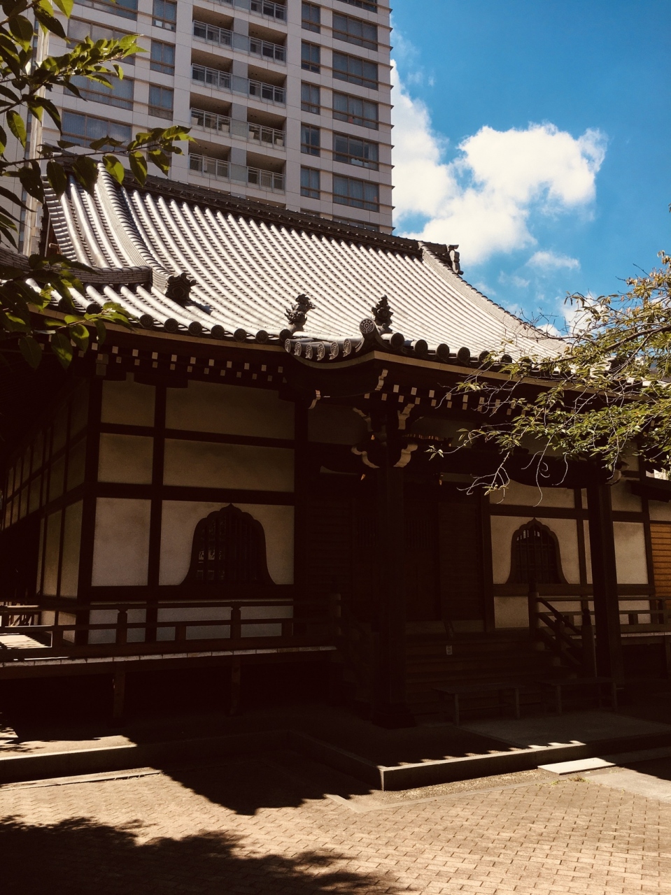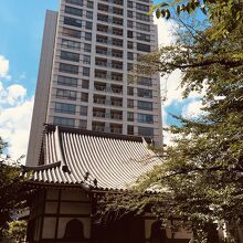 アメリカ大使館の裏側にあるひっそりとした寺でした。駐車場の横には大きな桜の木があって新緑が見事でした。舗装された境内で、本堂の裏手にお墓があります。後方には高いビルがありましたが、静かな穴場の場所でした。