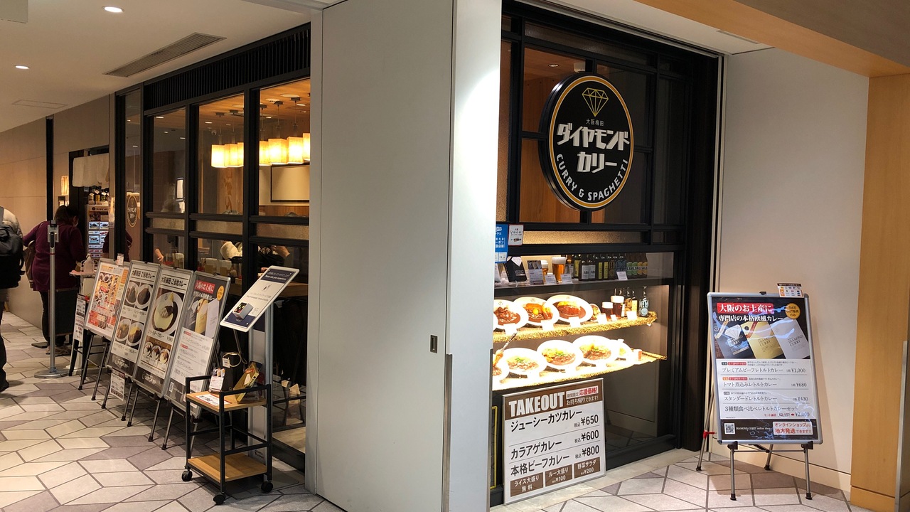 大阪駅前ビルの地下にある、昔ながらのカレー屋さんです。伊丹空港のリニューアルとともに、空港内に支店ができました。2022年2月は、テイクアウトがとても安くなっていました。例えば、店内950円のカツカレーが、テイクアウトだと650円です。