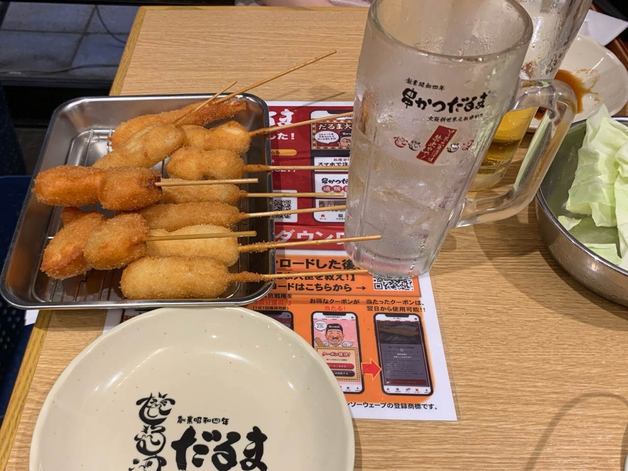 こちらの串カツ、衣が薄くサクッと揚がっているのが好きで大阪にくると立ち寄っています。