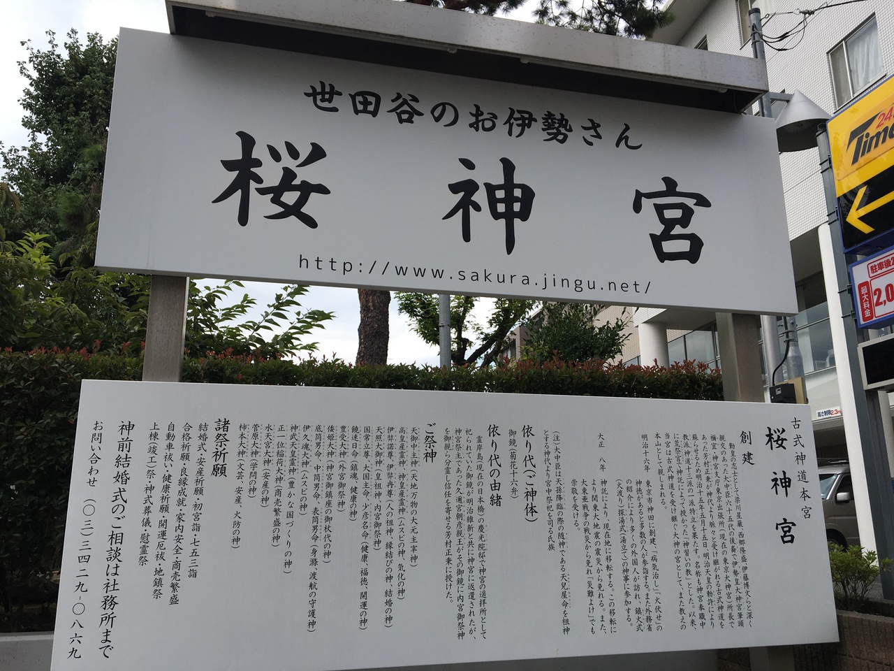 カツオとワカメの銅像がある桜新町駅北口から歩いてすぐの場所にあります。鳥居の前に大きな看板が出ており、「世田谷のお伊勢さん」と書かれていました。おみくじを結ぶところが桜の形をしていたり、名前にちなんだ可愛い演出がありました。桜の時期ではなかったので参拝の方はあまりいませんでしたが、静謐な雰囲気の感じられる神社でした。