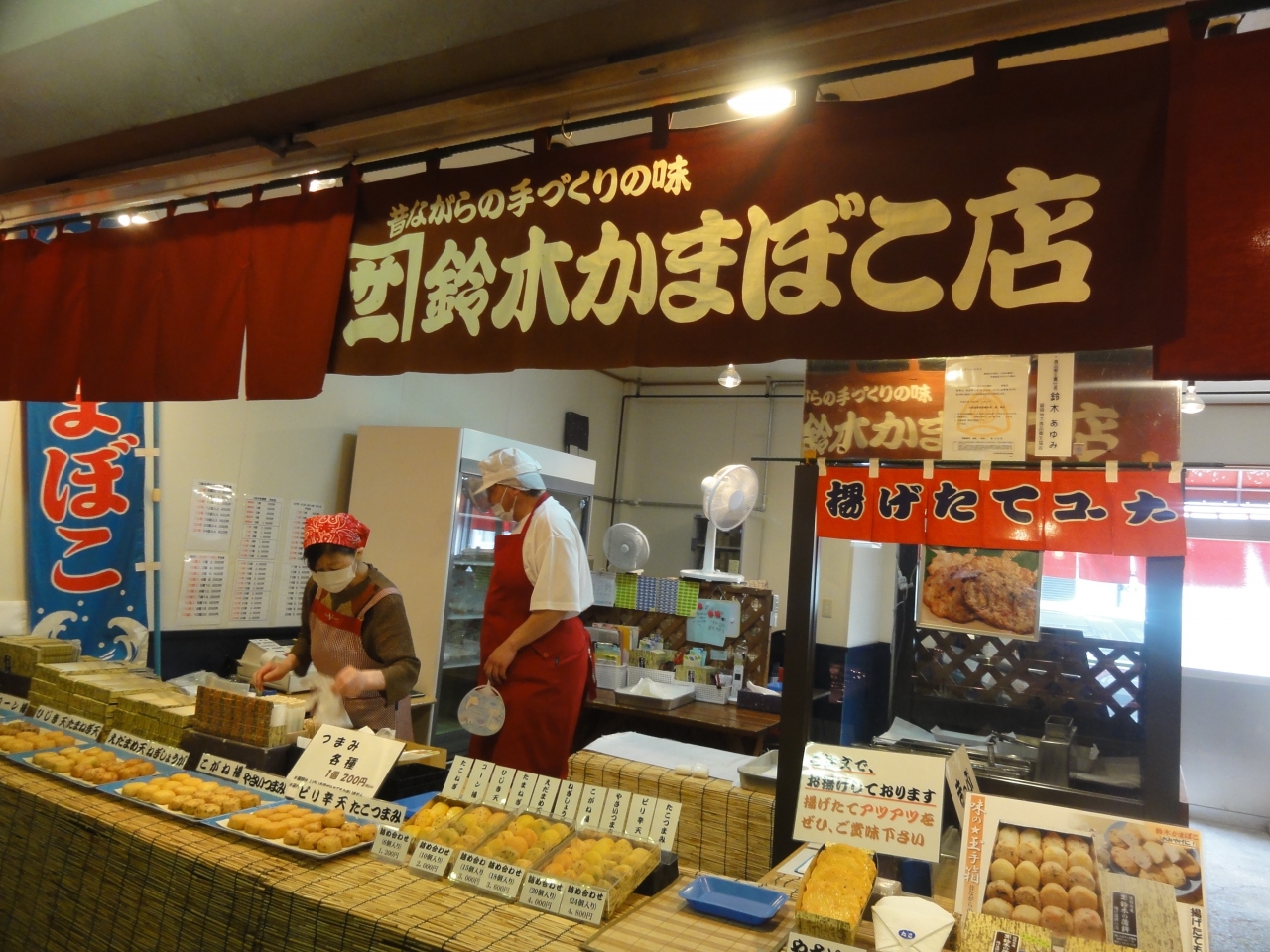 留萌駅前の自由市場内にあるかまぼこ屋さんです。自家製練り物生地にえびや野菜、えだ豆、ひじき、たこ葱、コーン、葱生姜、玉ねぎ等の具材が入ったかまぼことたこつみれがありました。4種類購入しましたが「熱々を食べたいなら揚げますよ」と声をかけてくれます。