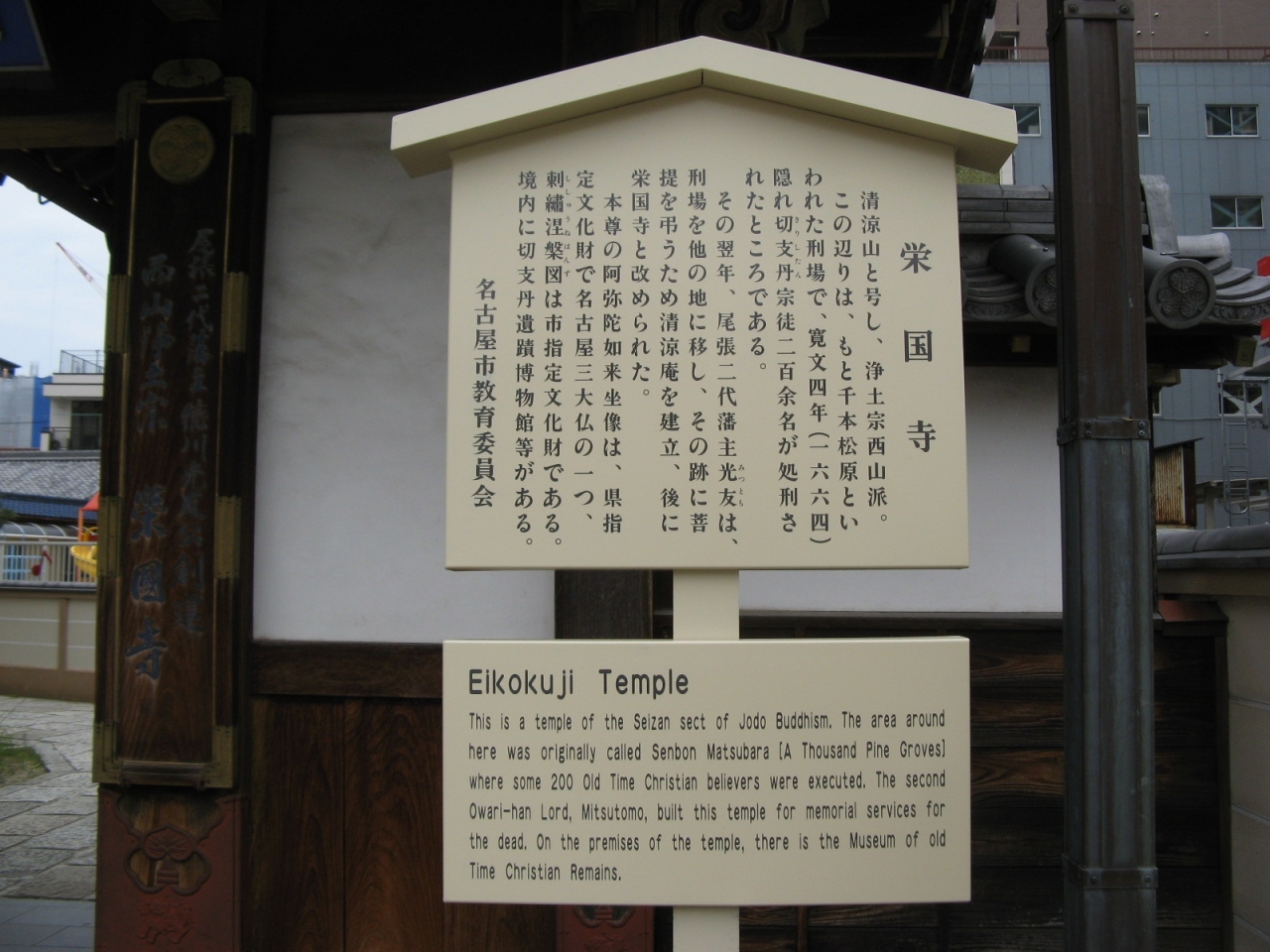地下鉄東別院駅から歩いて10分足らずのところにある浄土宗西山派のお寺さんです。案内板によると、江戸時代この辺りは刑場があったところで、処刑された隠れ切支丹等を弔うために建立された庵がもとになったお寺さんだそうです。そんな歴史から境内には、切支丹塚や切支丹の墓石、キリシタン遺跡博物館など切支丹関連の見所が多いです。