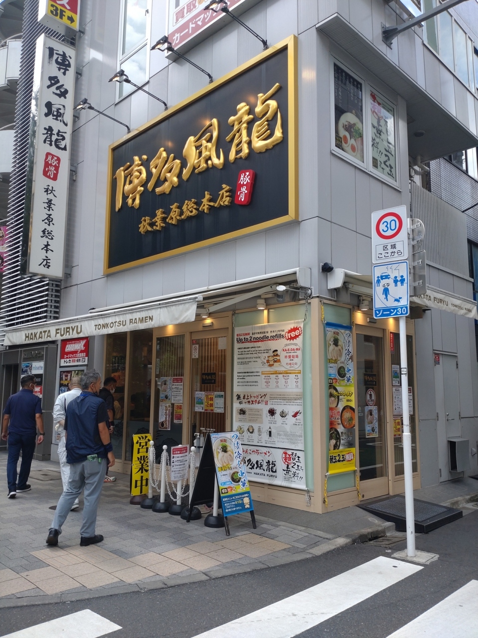 秋葉原の中央通り沿い、地下鉄銀座線末広町駅近くにあるとんこつラーメン店。替玉2玉までは無料というサービスは、未だ継続されており、嬉しい。本場でもなかなか出会うことの少ない真っ白なスープは、かなり濃厚だが、とろみはそれほどなく、豚骨臭もあまりしない。この当たりが、東京でもウケている要因かと。麺はストレートで、秒茹での「ばりかた」、15秒の「かた」、25秒の「ふつう」、50秒の「やわ」があるが、ばりかた、かたの相性がいい気がする。以前よりは少し上がったとはいえ、ラーメン一杯650円で替玉2杯付きはかなりコスパがよく、セットで煮玉子(黄身がトロトロ)とネギ増を加えても800円。野菜不足解消とは言わないまでも、少しは罪悪感がなくなるかも。