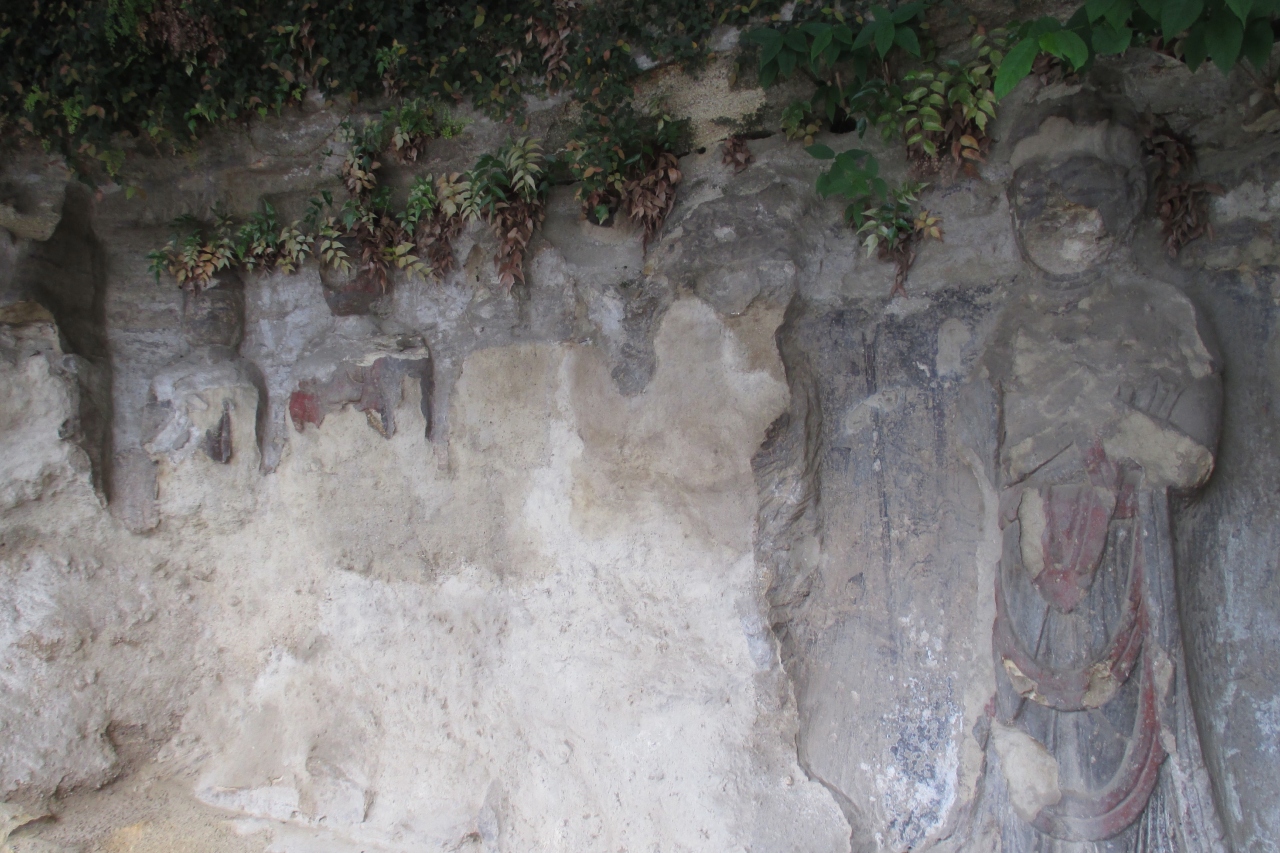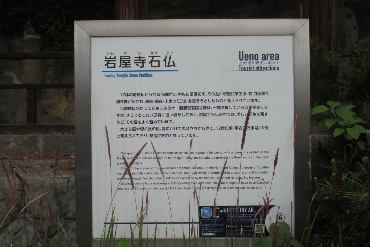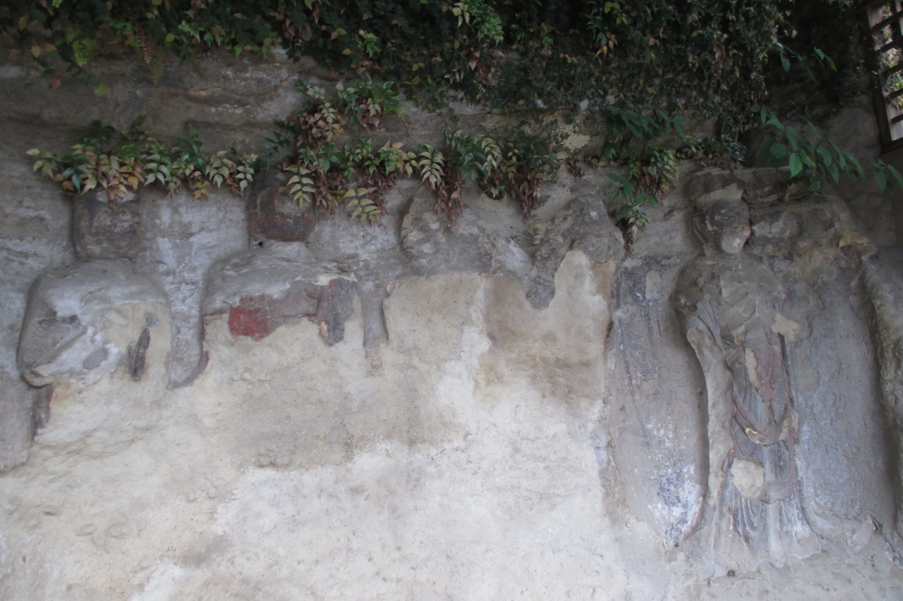 岩屋寺石仏は大分元町石仏の300mくらい南といったところにありました。大分元町石仏と同じ岩質の崖に彫られたものだと思います。中央に薬師如来、左に釈迦如来、右に阿弥陀如来で、過去・現在・未来が表わされているのだそうです。全体では17体の磨崖仏からなっていて、12世紀・平安時代後期の作とみられているそうです。残念ながら、傷みが激しく、仏像がよく分りませんでした。