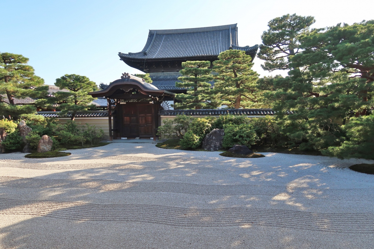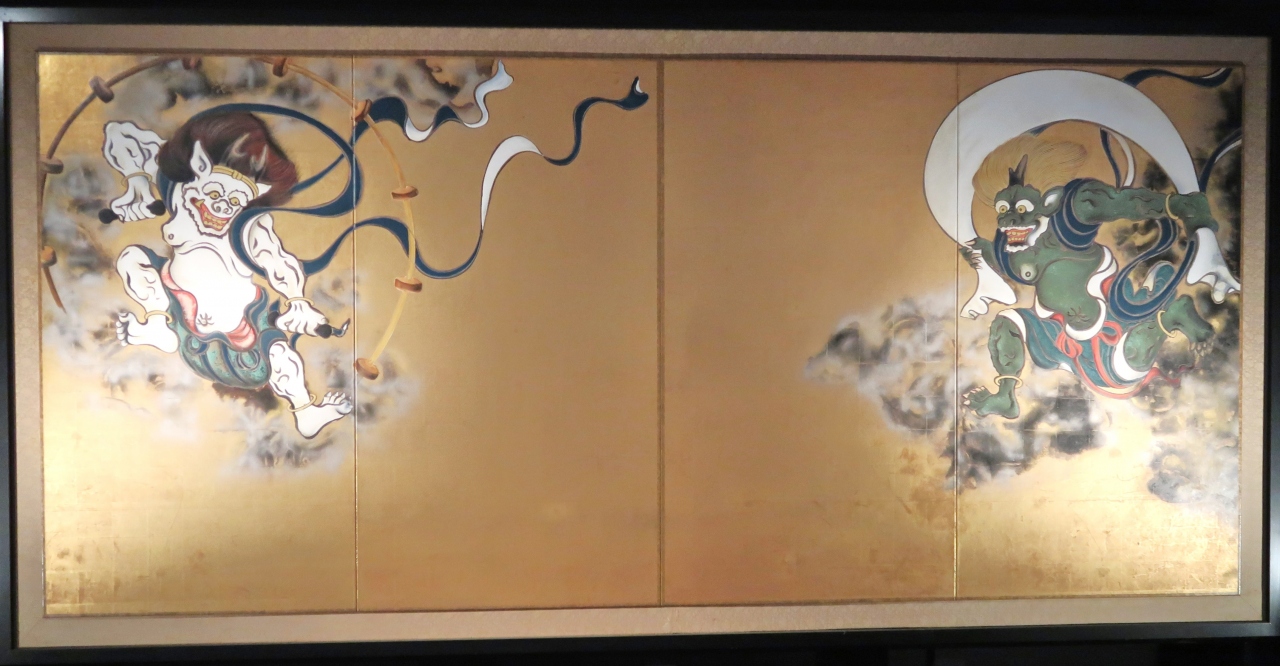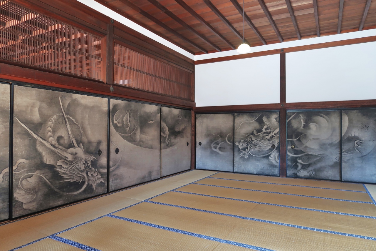 三門望闕楼前の放生池や洗鉢池を眺めながら、有料エリアの本坊を目指しました。庭園が美しく、特に小書院と大書院の間にある潮音庭は、中央の三尊石の背景に有名な「風神雷神」の金色の屏風が配されていて、強く印象に残りました。方丈にある襖絵「雲竜図」も、「風神雷神」と同じく複製展示ですが、渦を巻く風に流される雲からぴゅーんと飛び出してくる二匹の龍が幻想的でした。