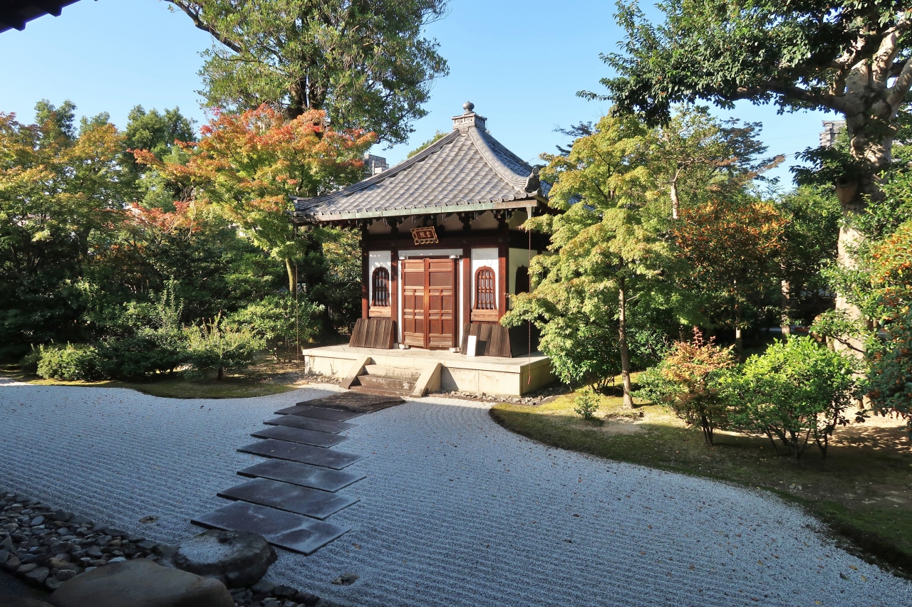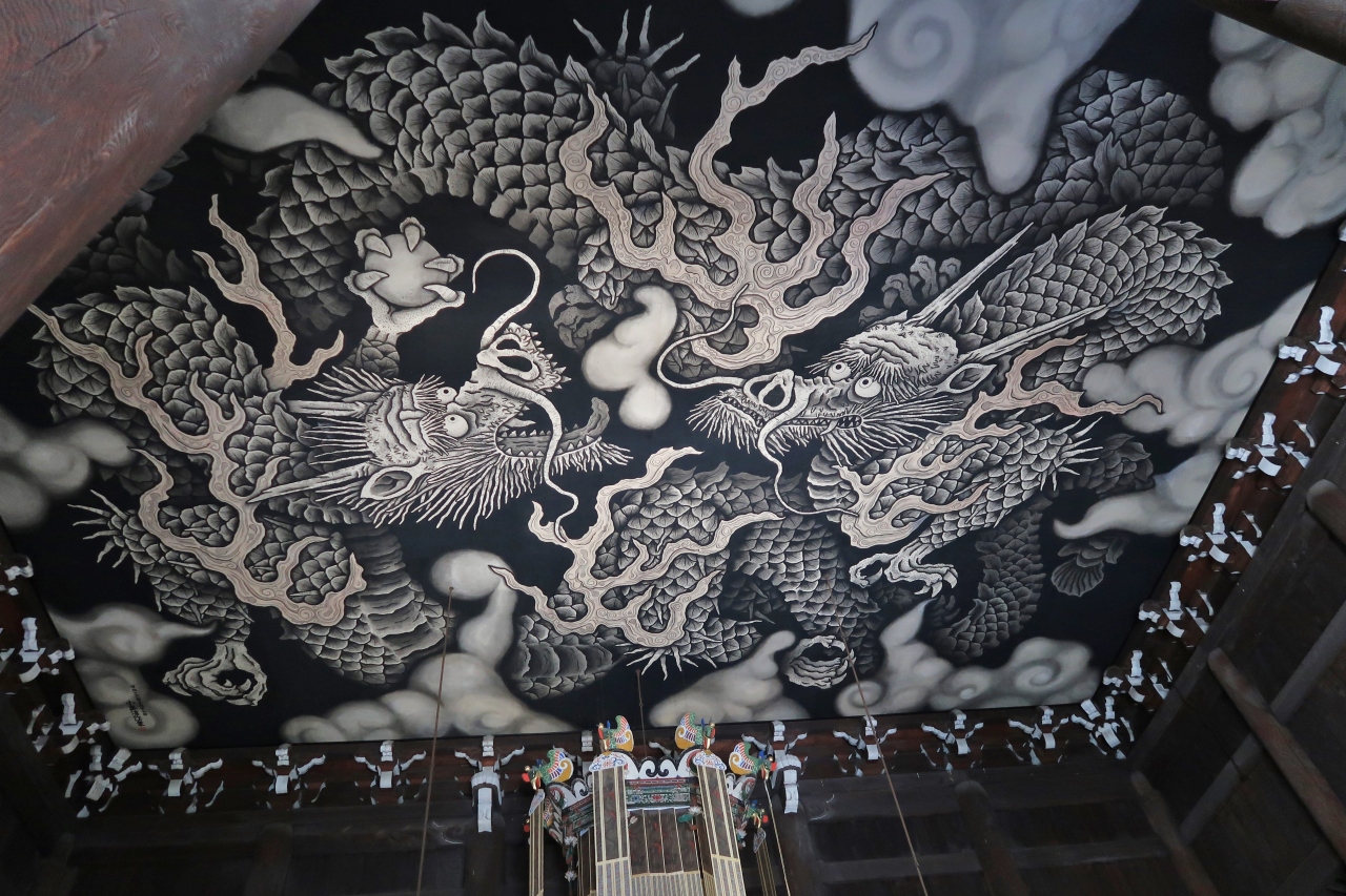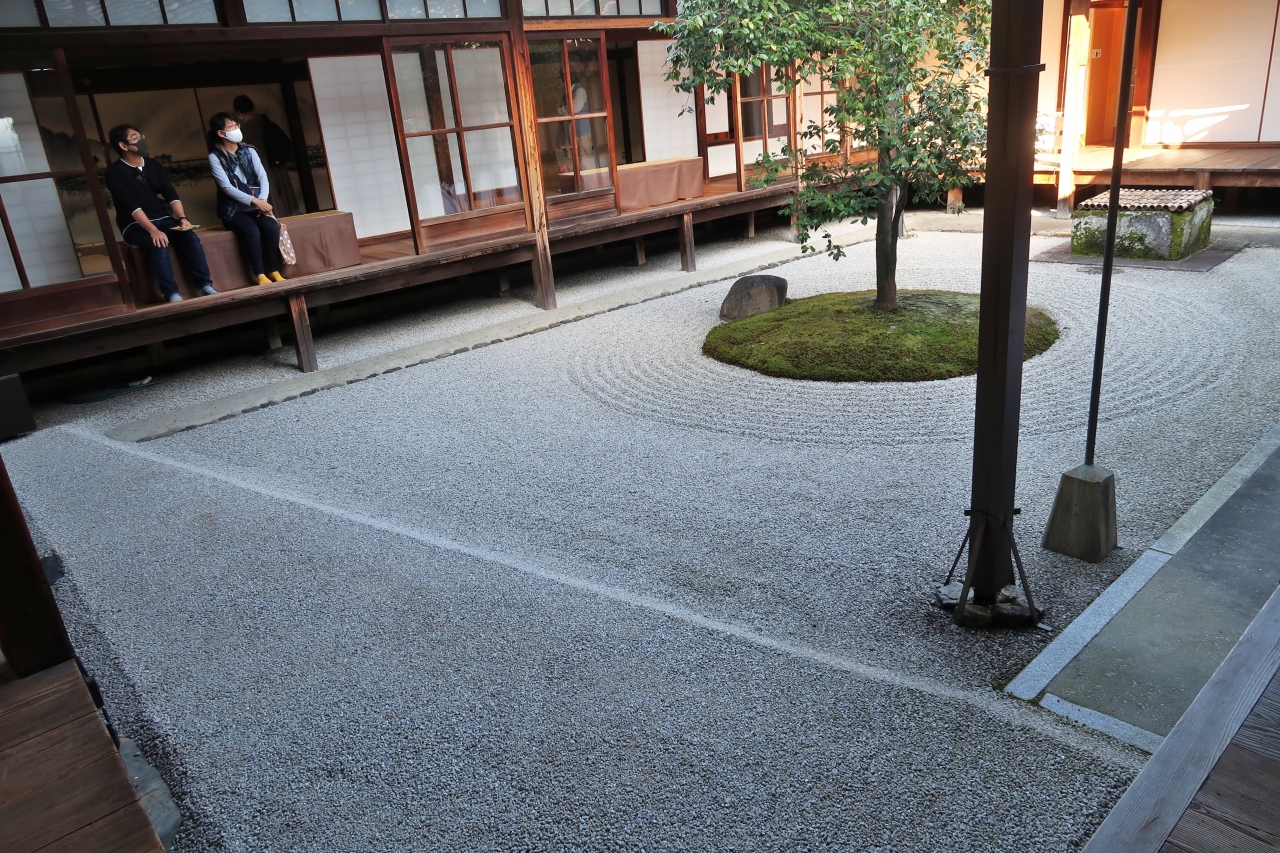 三門望闕楼前の放生池や洗鉢池を眺めながら、有料エリアの本坊を目指しました。庭園が美しく、特に小書院と大書院の間にある潮音庭は、中央の三尊石の背景に有名な「風神雷神」の金色の屏風が配されていて、強く印象に残りました。方丈にある襖絵「雲竜図」も、「風神雷神」と同じく複製展示ですが、渦を巻く風に流される雲からぴゅーんと飛び出してくる二匹の龍が幻想的でした。