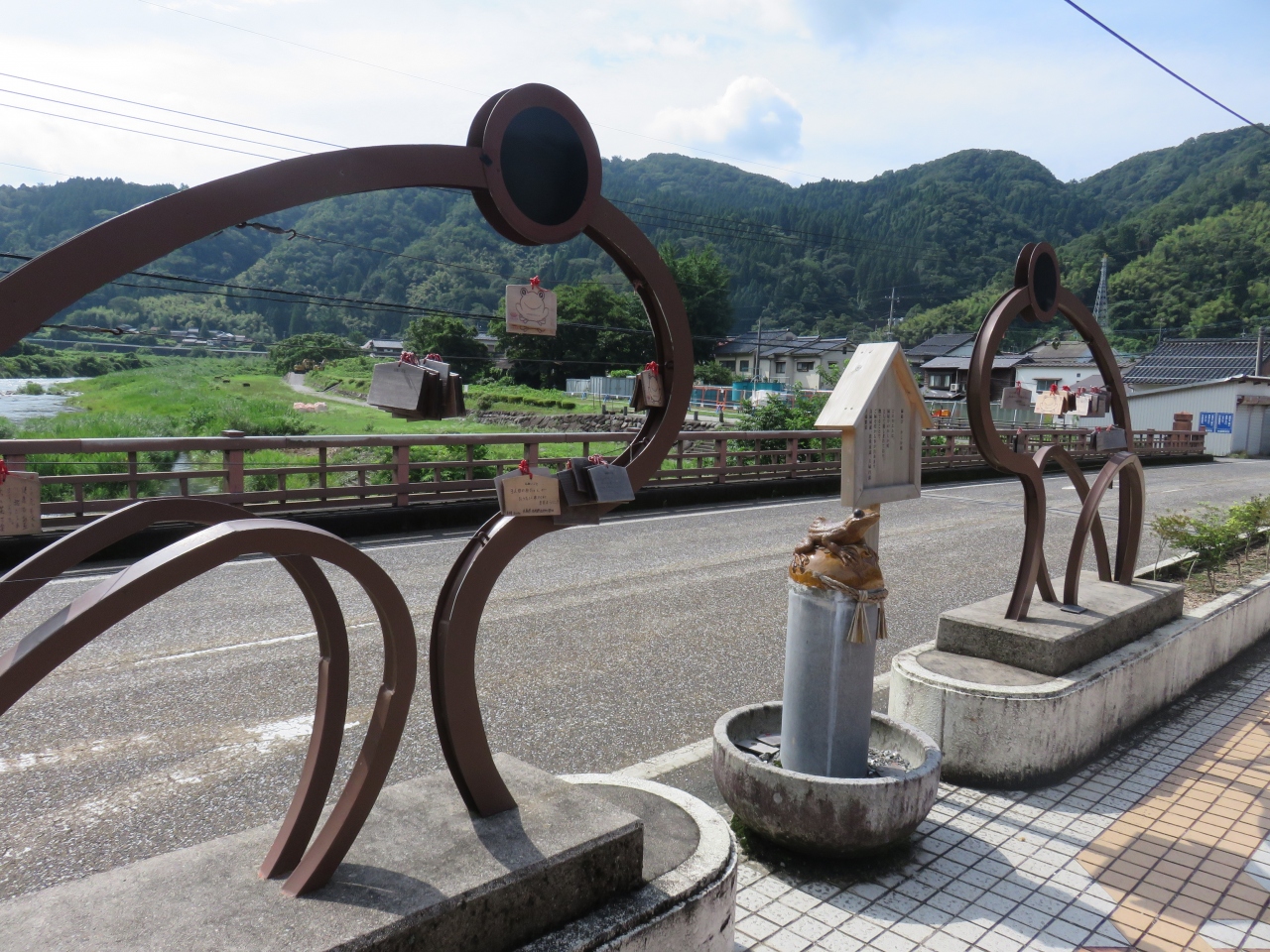 橋の中ほどの下流側の歩道には、三徳川の名物であるカジカガエルの陶製の像があったり、夜のライトアップがあったりと、雰囲気がありました。