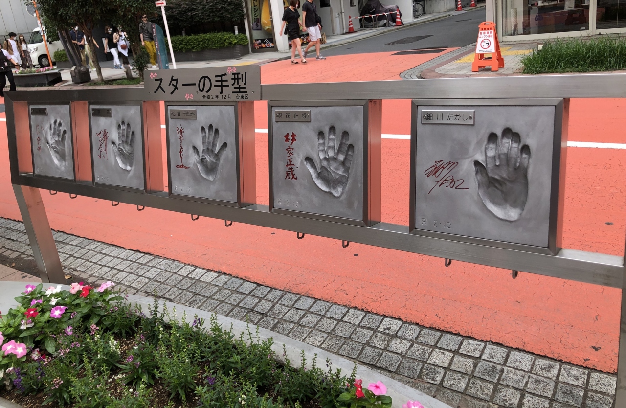 浅草寺のすぐ近くにある商店街です。仲見世通りと並行に走っています。道路はオレンジ色に塗装されていて、インパクトがありました。また、通り沿いには「スターの手形」と題されたオブジェがあり、芸能人の手形が多数並び、こちらも見所です。