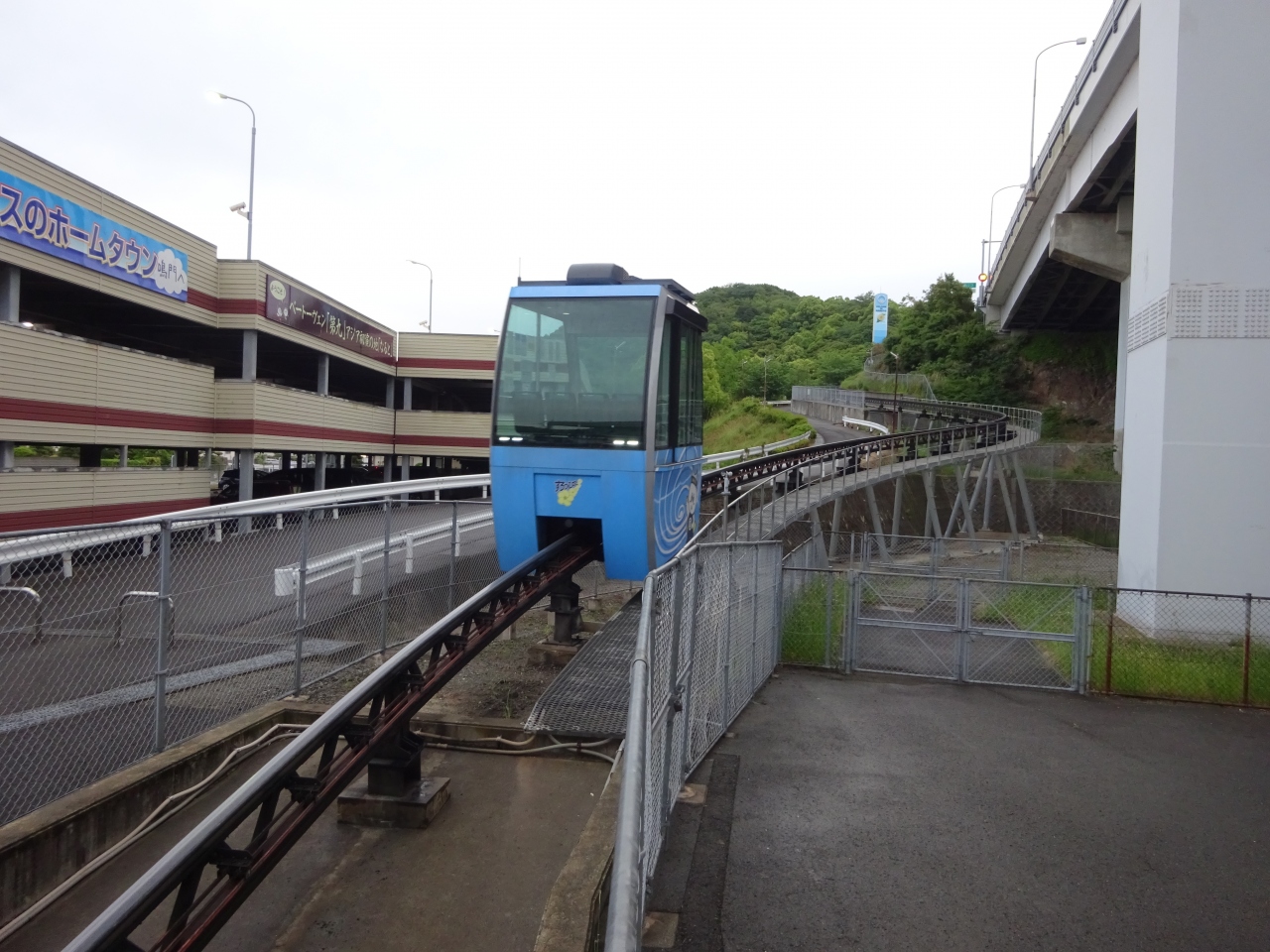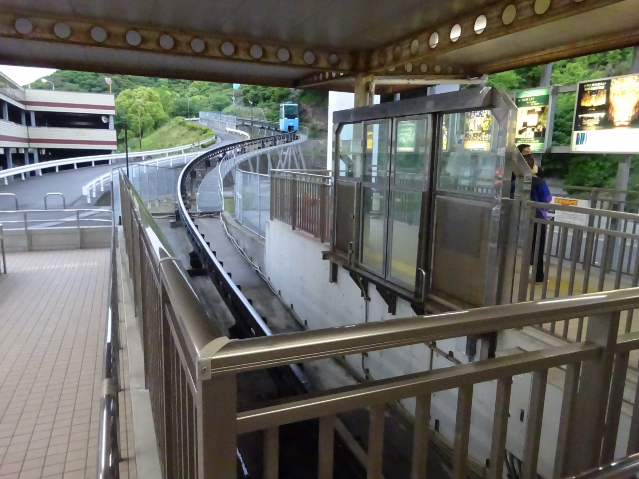 高速鳴門バス停は、淡路島方面から小鳴門橋を渡った先にあり、地上からかなり高い位置にあります。そこには延々と坂道が続いているのですが、それに並行してモノレールのような乗り物があります。