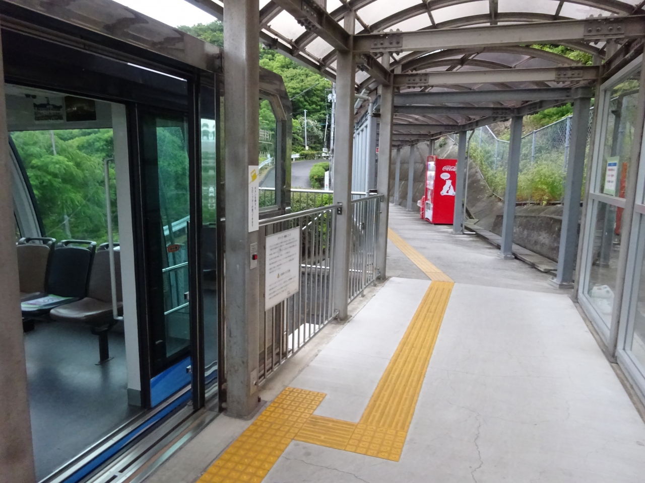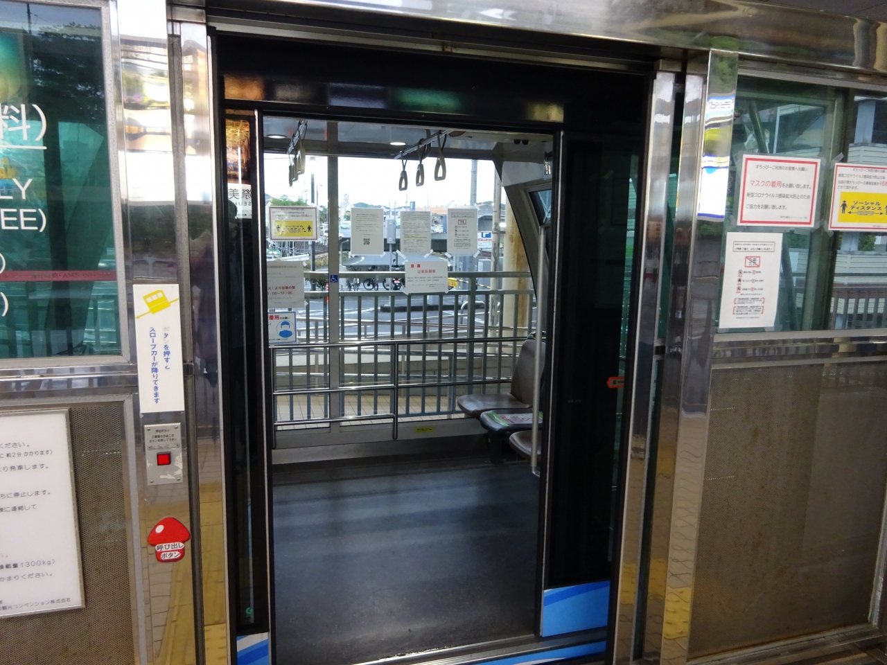 これが「すろっぴー」で、扱いは「横に動くエレベータ」。操作もエレベータと同じで、乗り場のボタンを押すとやってきて、内部のボタンを押すと扉が閉まって動き出す、無人の乗り物です。