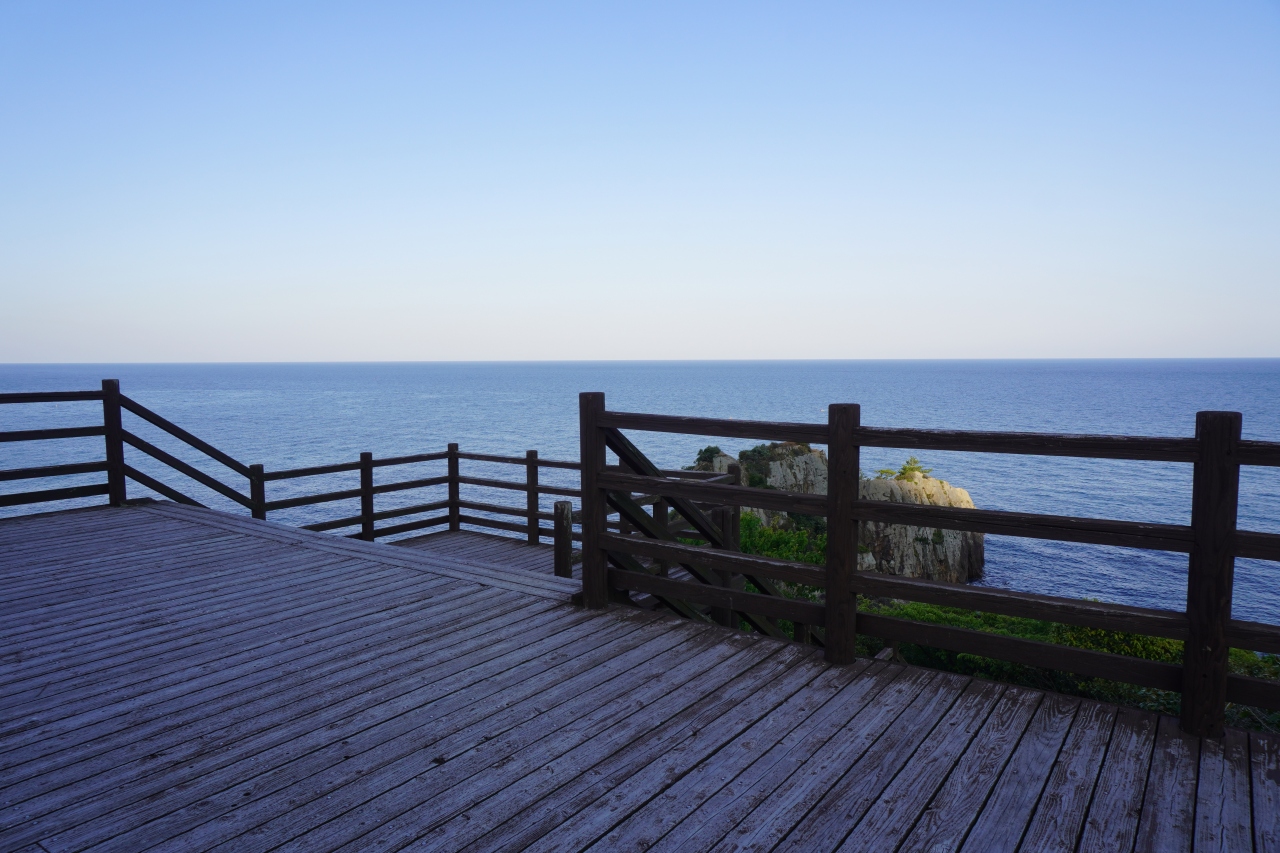 鬼海ヶ浦展望所は、下田温泉から海沿いの国道に出て左折してすぐ。国道沿いに立派な駐車場があるので、すぐに分かります。展望所は海に向かってウッドデッキのような形の造り。少し下に降りるような感じで先端に向かいます。半島のような岩山から右手が鬼海ヶ浦かな。夕日の名所でもあるようです。