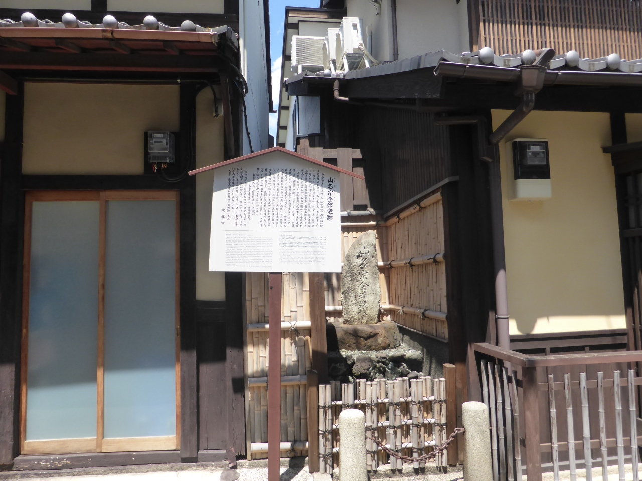 応仁の乱(1467~1477)の西軍の総大将だった山名宗全の京都の邸宅跡。応仁の乱で、宗全率いる西軍はこの宗全邸が拠点になったため、西軍の本陣として機能したことを示す碑です。このあたり一帯を「西陣」と呼ぶのは、山名宗全率いる西軍が陣をおいたことによる。現在は住宅地となっていて遺構はなく碑のみあります。