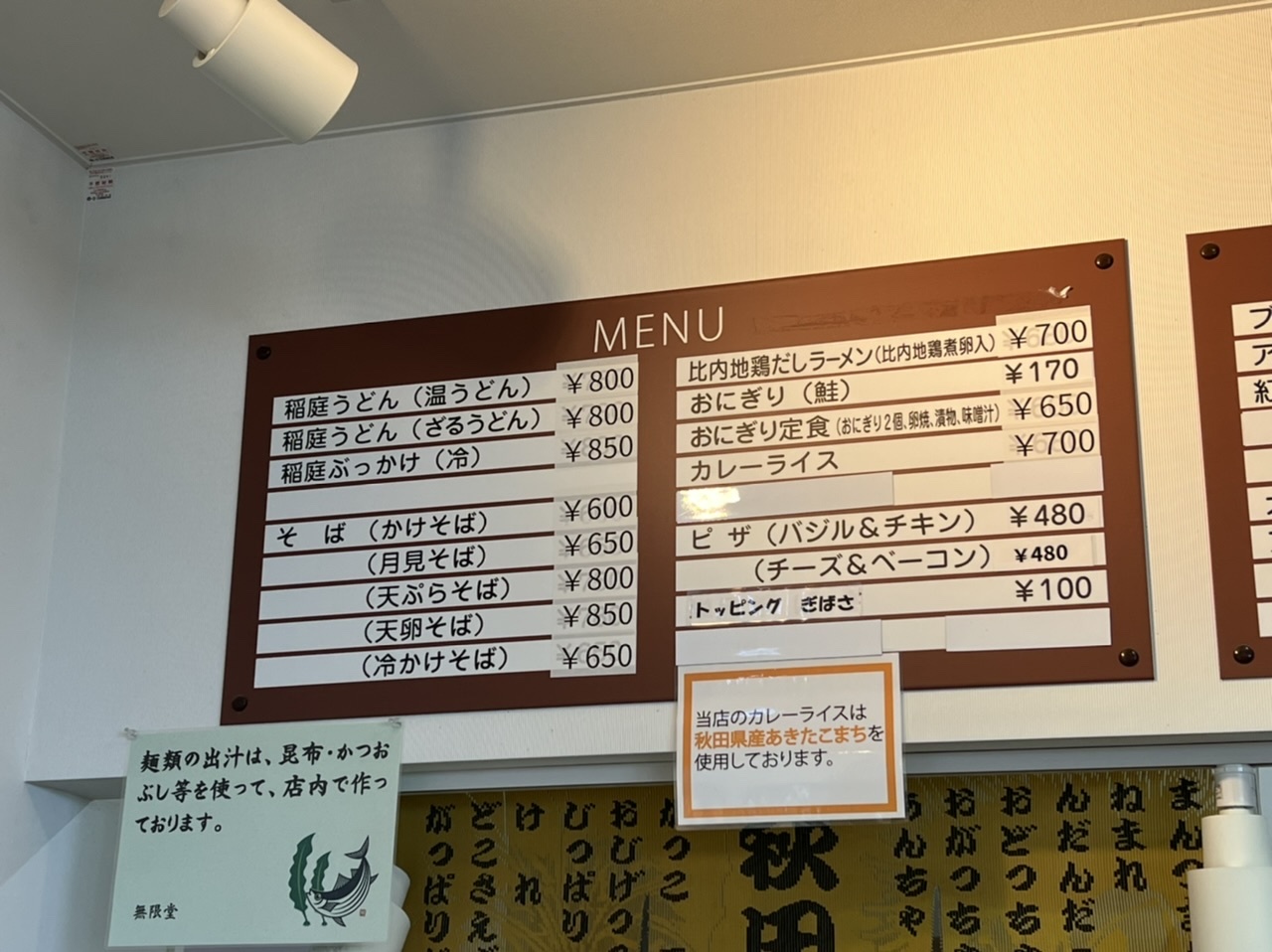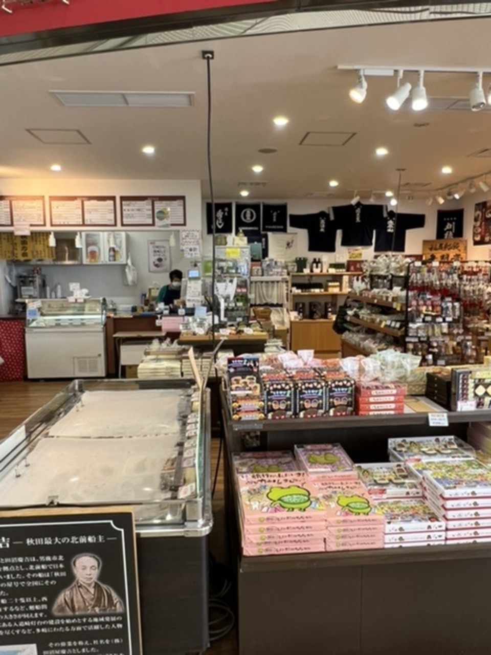 秋田空港、手荷物検査後の待合スペース脇にあるお土産+飲食店。稲庭うどん800円、そば600円~、比内地鶏だしラーメン700円と手頃な価格で食事を取れます。お土産はそこまで品揃えがあるわけではないので、手荷物検査前に買うことをおすすめします