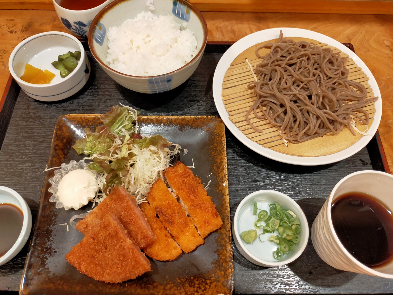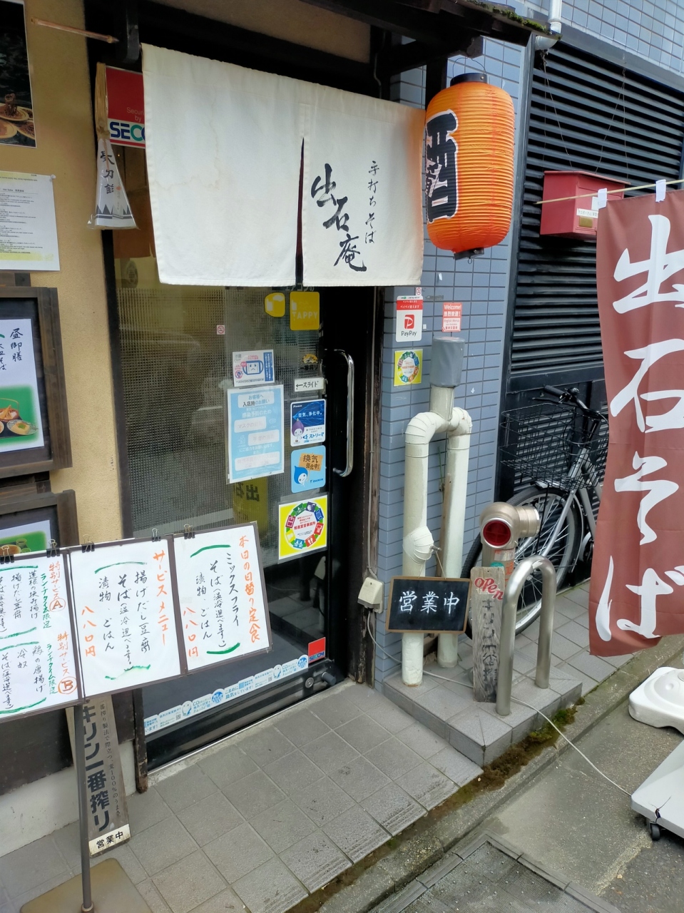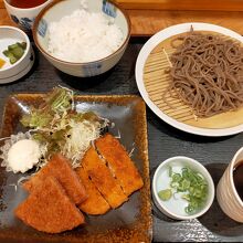 京都市役所裏にある、いずしそばの店です。お昼のランチ時間には、サ一ビスメニューと日替わり定食があります。日替わり定食を注文したところ、ミックスフライとそば、ごはんに漬物でした。そばは温と冷が選択可能です。麺はやや硬めの細麺、皿そばで美味しいです。