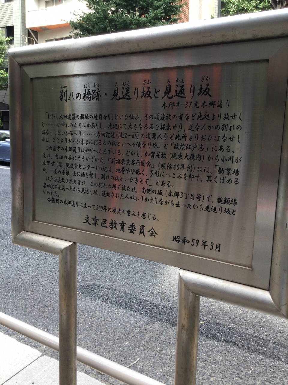 地下鉄本郷三丁目から赤門方面へ向かう坂道で、菊坂の入口近くが「別れの橋跡」です。江戸追放の罰を受けた者とその親類の別れの場所だったという。それは現在から500年もの歴史がある。坂の勾配は緩やかで、車等通りはやや賑やかです。そのような悲しい場所のようには思えません。