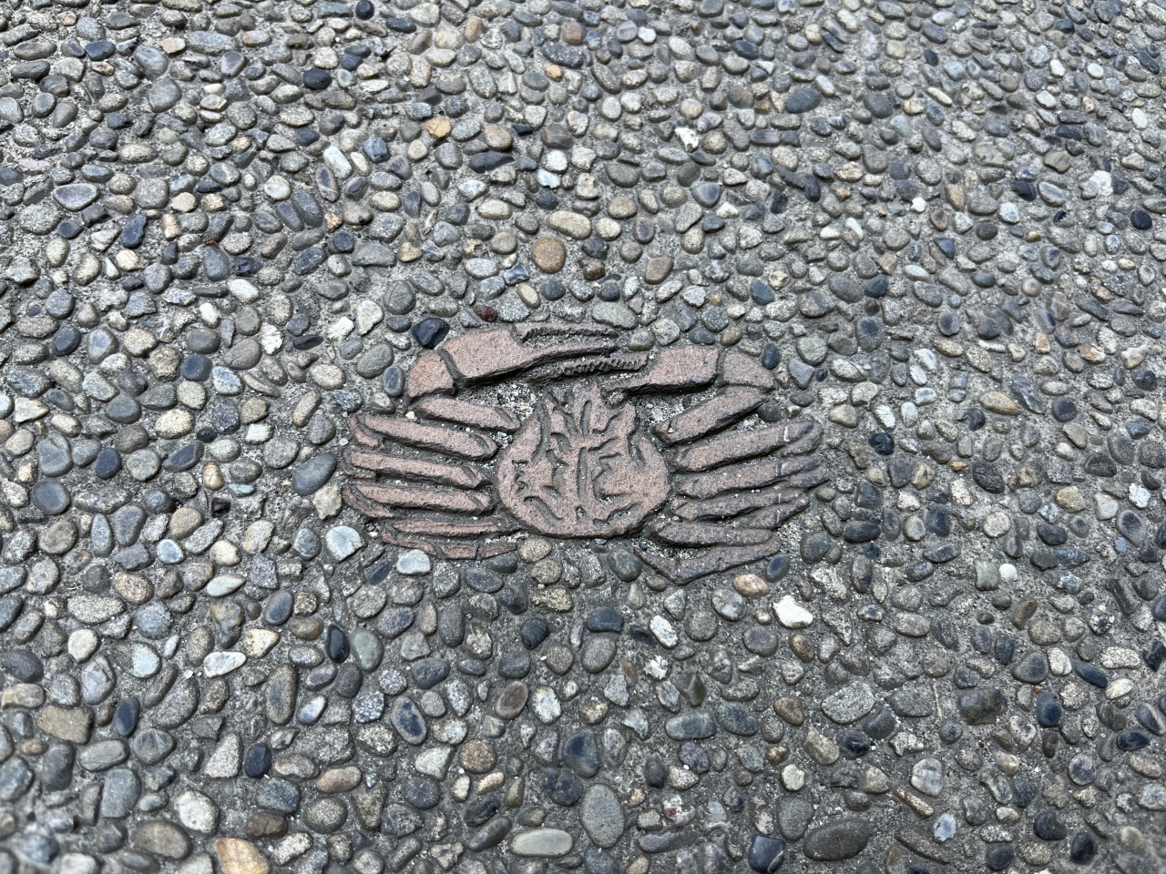 城崎温泉の外湯のひとつの御所の湯、建物が立派なので見落とすことはなさそうですね。周りにお土産屋さんなどが多いのでお湯に入らなくても楽しめるエリアです。御所の湯の入口手前の地面にはカニのデザインが施されているのがかわいいです!