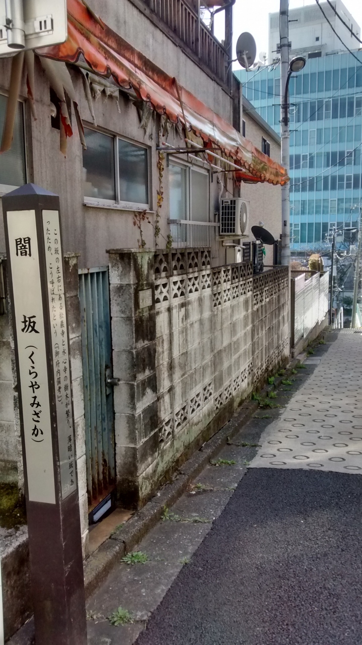 闇坂は、神社・寺院なども多くある新宿のレトロ感あふれるエリアにあって、徒歩散策が絶対おすすめのエリアが周辺に広がっています。難点は坂が多いことですが、添付写真のように、説明柱の横の古臭い住宅がとても魅力的でした。