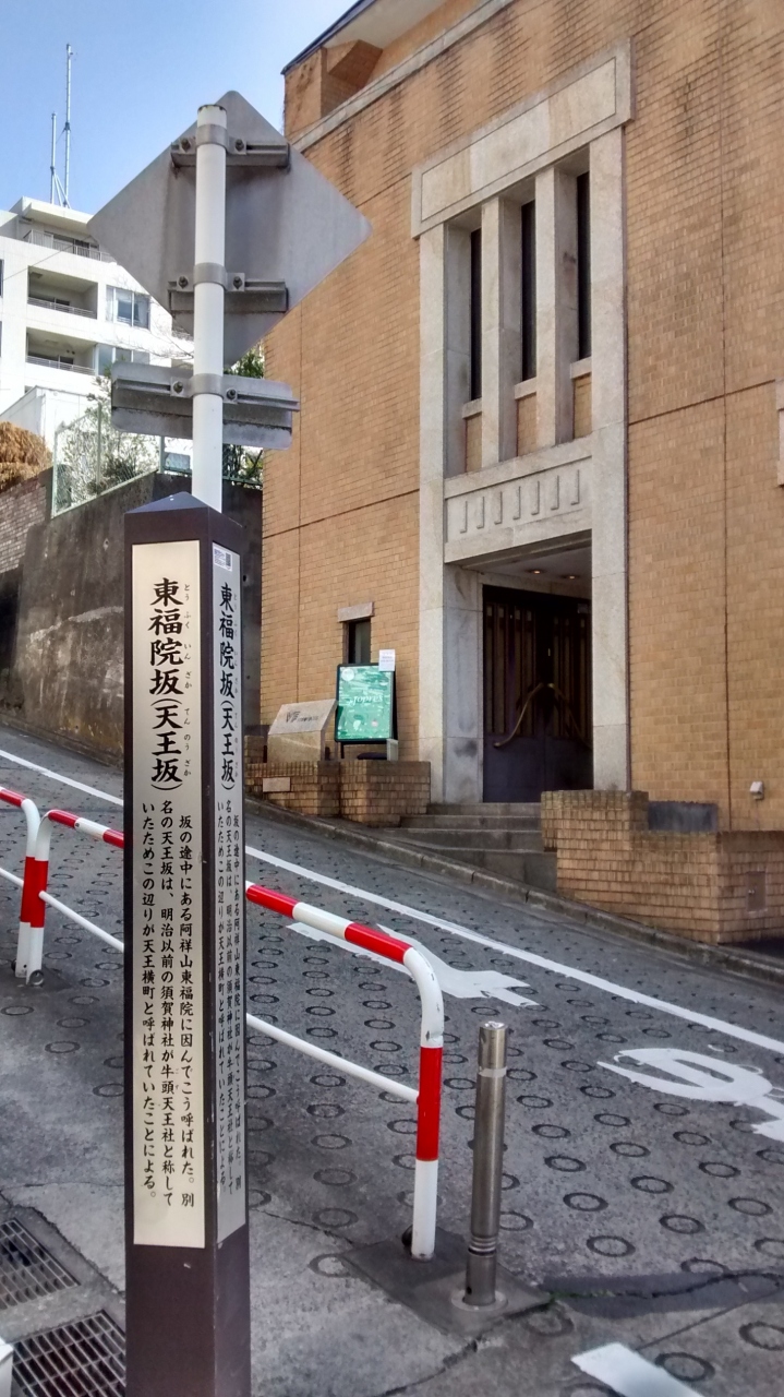 東福院坂 天王坂は、神社・寺院なども多くある新宿のレトロ感あふれるエリアにあって、徒歩散策が絶対おすすめのエリアが周辺に広がっています。難点は坂が多いことですが、添付写真のように、しっかり説明柱があって、勉強しながら散策できます。