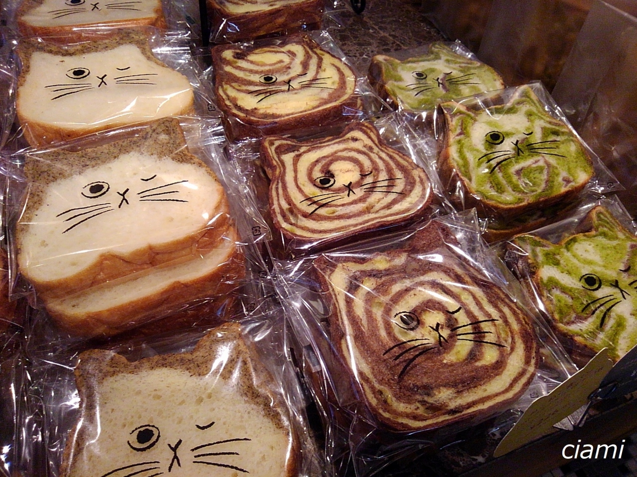 三毛にトラ、マーブルに迷彩、いろんな色のねこ形のパンが並んでいます。