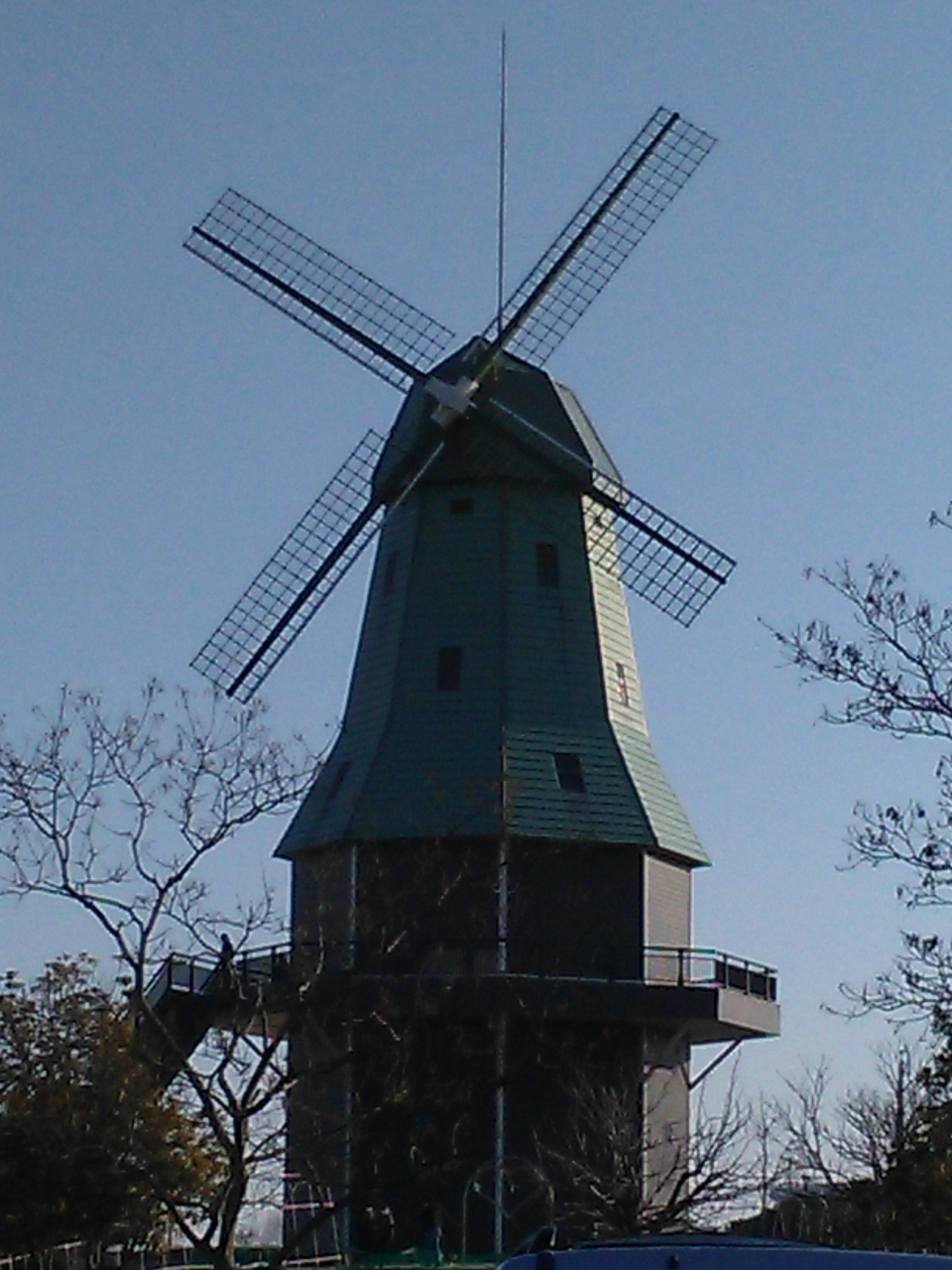 霞ヶ浦の湖畔に広がる公園で、大きな風車が建っていて、羽も回っている。塔の中段には、ベランダのようなでっぱりがあり、下からもそこへ階段で上ることができる。このでっぱりは風車を取り囲んでいて、。360度を見渡せる展望台となっている。風車の中には入れない。