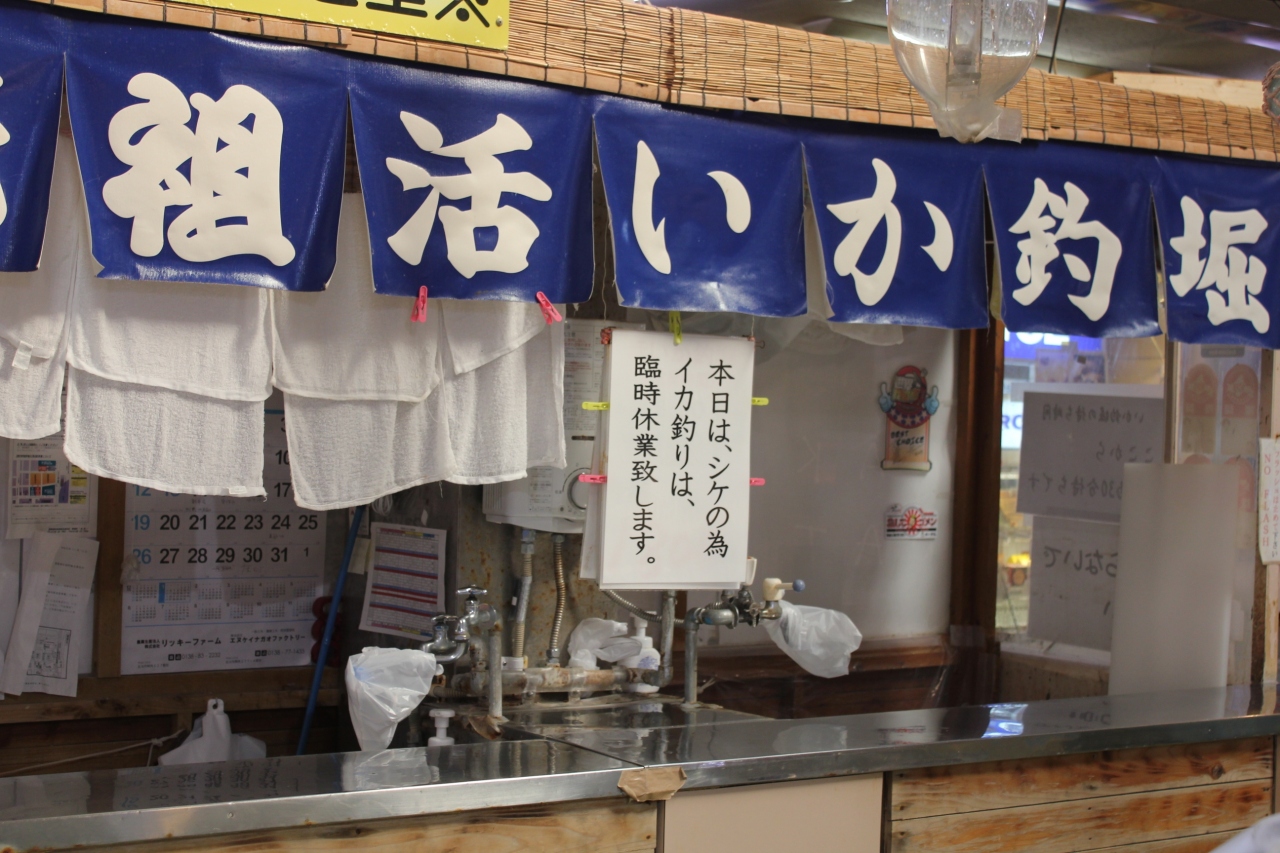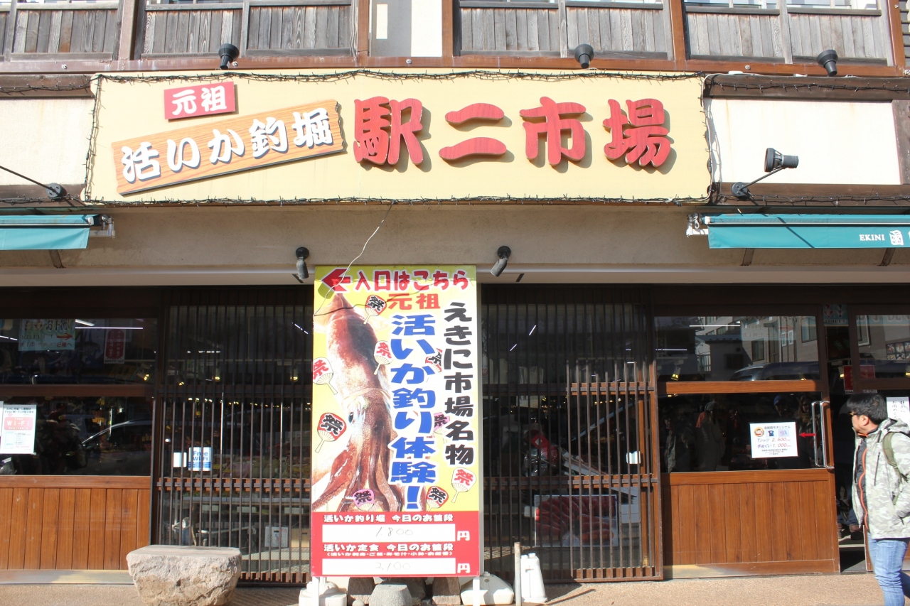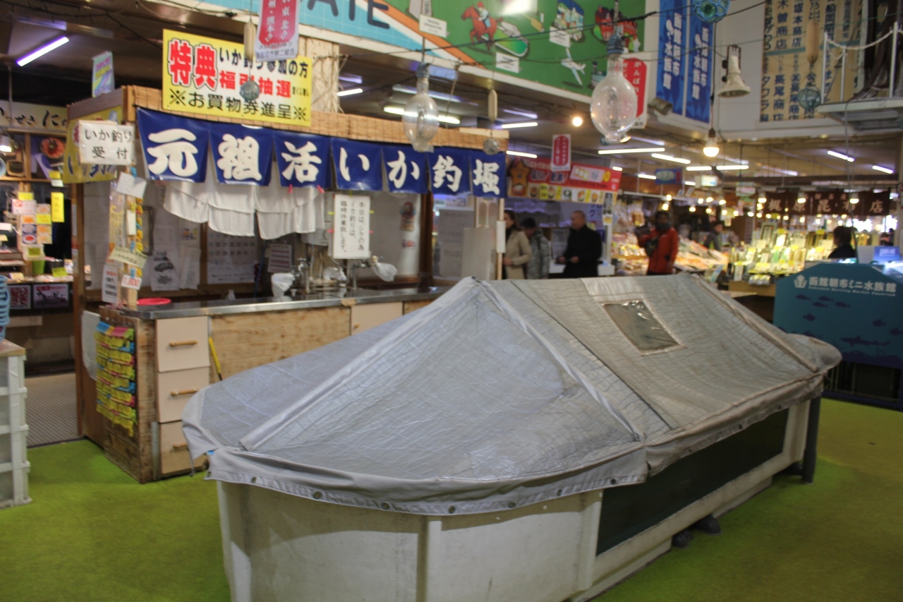 市場の中は海産物を売るお店が軒を連ねていて、その中央付近に「活いか釣堀」があり、釣ったイカはその場で刺身にして食べることができます。
