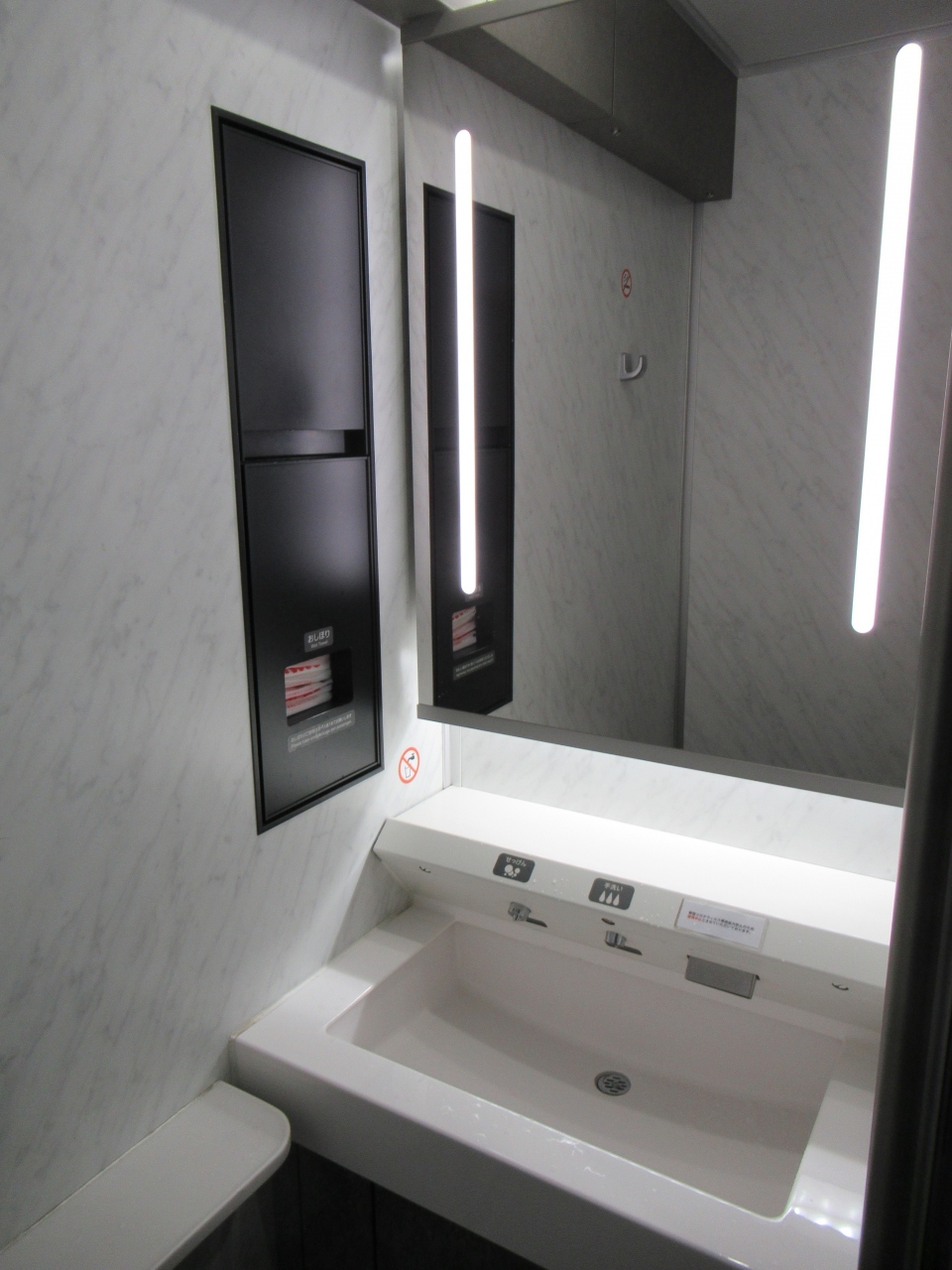 リクライニングシートが2+2列で配置されていて、背もたれを倒しても後ろの人の迷惑にならない構造になっていました。