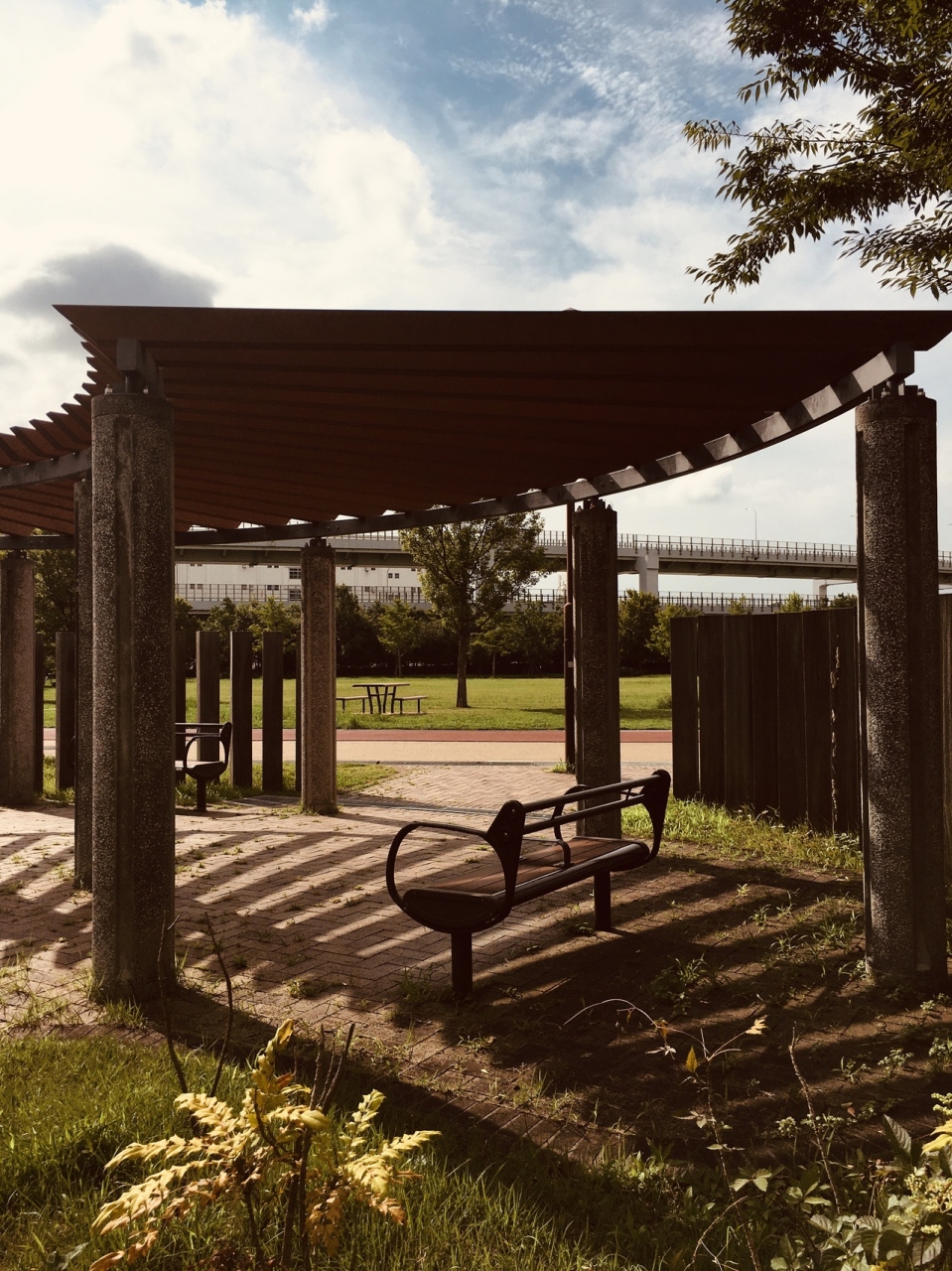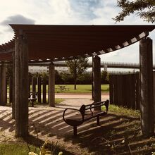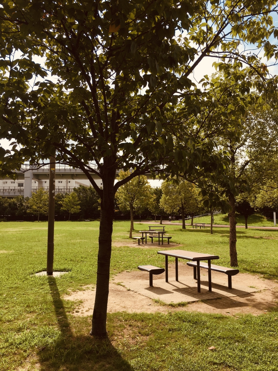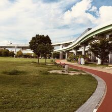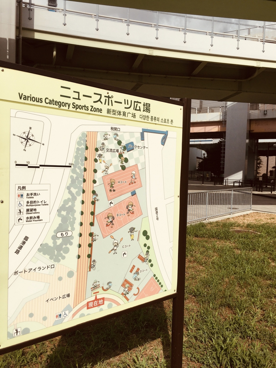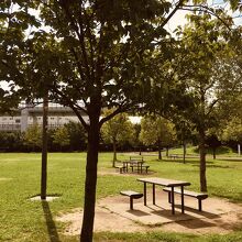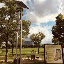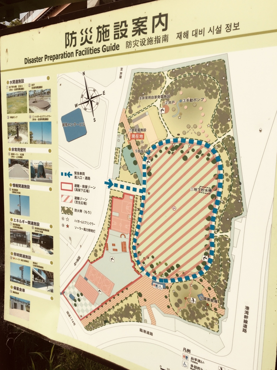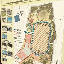 芝生のエリアを囲むようにして、木々、多目的広場、イベント広場、希望の丘等がありました。備蓄倉庫、非常用便所、井戸等、非常用設備もあり、災害時には多目的広場が避難場所になります。大きな公園で、バスケットボール等が出来るスポーツ広場もあります。