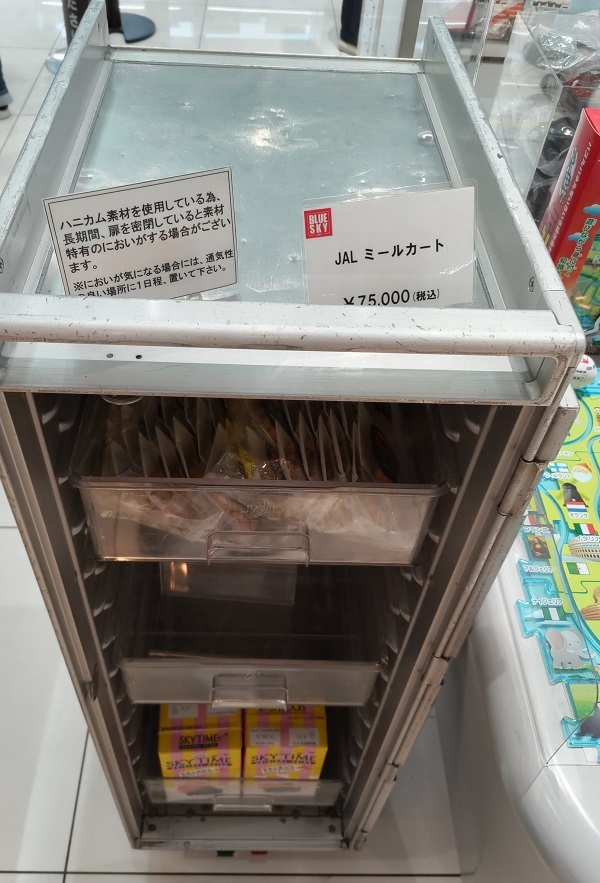 最近は飛行機の座席やカートなどが販売されることが増えました。羽田空港の第一ターミナル1階にあるブルースカイでもカートが販売されていました。ハーフサイズのカートで税込み75,000円でした。こちらのお店はカート以外にも飛行機グッズが豊富なのでおすすめです。