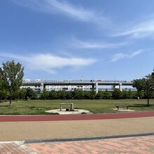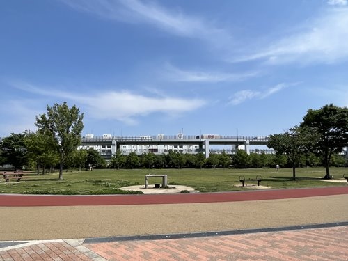 JR貨物の神戸港駅の跡地にできた都市公園です。正式名称は神戸震災復興記念公園。「みなとのもり公園」は愛称で、阪神淡路震災後の2003年(平成15年)に駅が廃止され、その7年後に公園としてオープンしています。中央に大きな芝生広場があり、災害時の避難場所として機能するようです。その周りをゆるやかにジョギングコースが巡っていました。