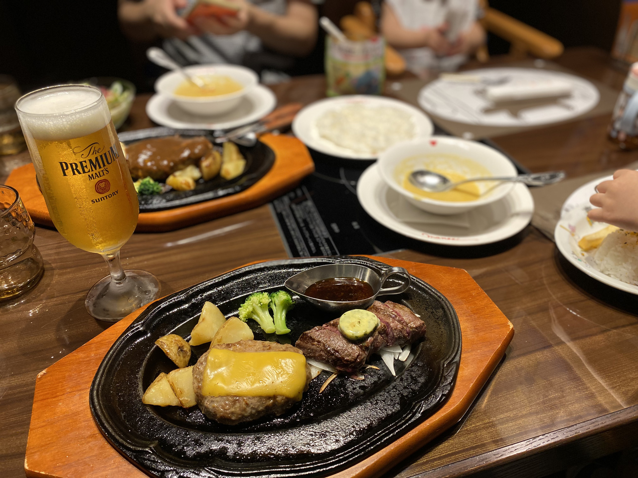 新しく肉の万世です。妻がお気に入りのチェーン。この日は娘の誕生日記念で、義理の両親にご馳走してもらいました。ステーキもハンバーグも美味い!ちょっとリッチなお値段ですが誕生日なので甘えます。写真撮影のサービスは平成初期のままとのことで伝統も嬉しいですね。