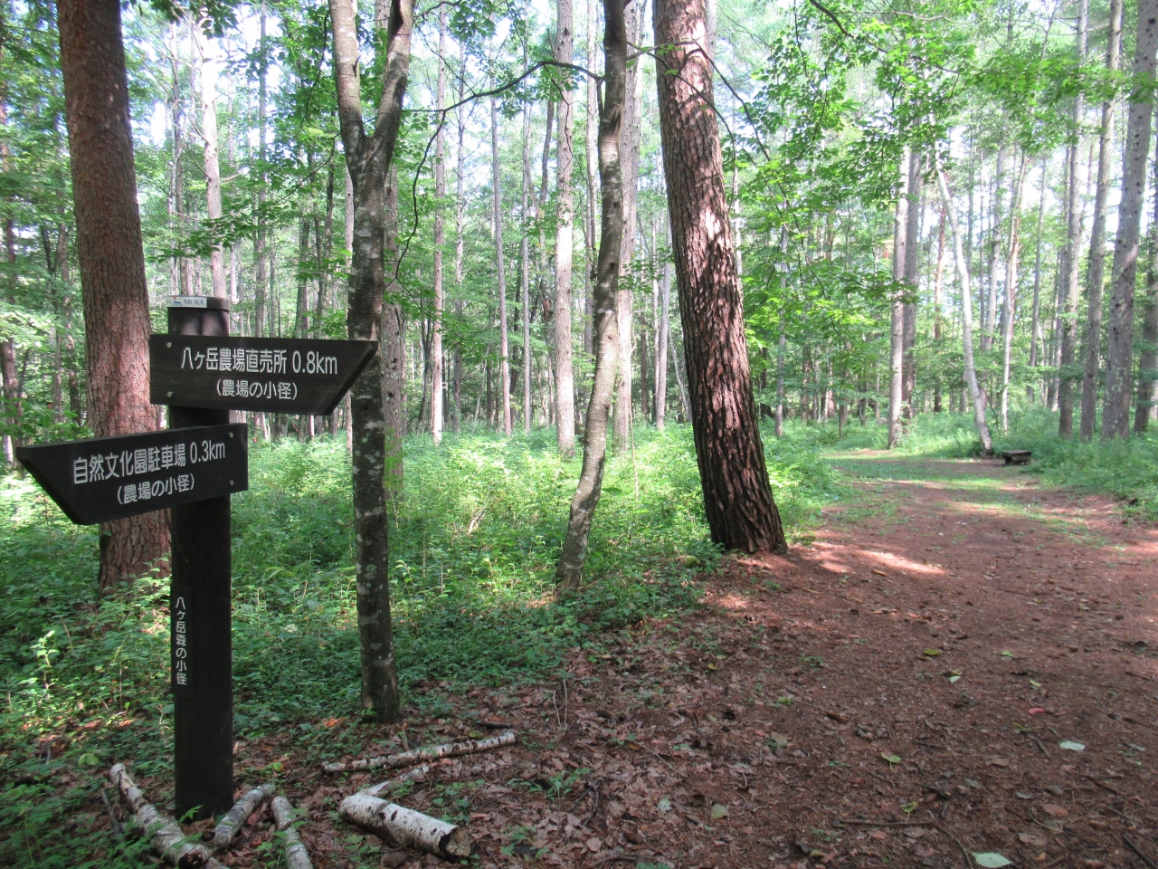 園内にはきれいな芝生が広がる36ホールのパターゴルフや、ドッグラン、ピクニック広場の他、アスレチック広場やディスクゴルフ、マレットゴルフ、子供用自転車コースなど広々とした施設が造られています。文化園から牧場や野菜直売所がある八ヶ岳中央農業大学校までは、1.1㎞程の散歩道が設置されていて、森の中の砂利道や土の道をのんびり散策することができます。ほぼ平坦の道なので子どもからシニアの方まで森林浴が楽しめます。