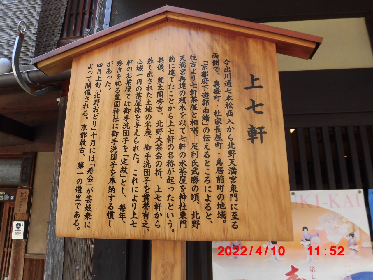 京都市観光で立ち寄りました。上七軒は、栄枯盛衰は激しいみたいですが、元は上京区真盛 から社家長屋町にまたがる地区にある花街だったそうです。「上七軒」の由来は、室町時代に北野天満宮の再建の際に残った資材を使って7軒の茶店を建てたことからきているとのことでした。現在は、北野天満宮の東参道と表示されてます。