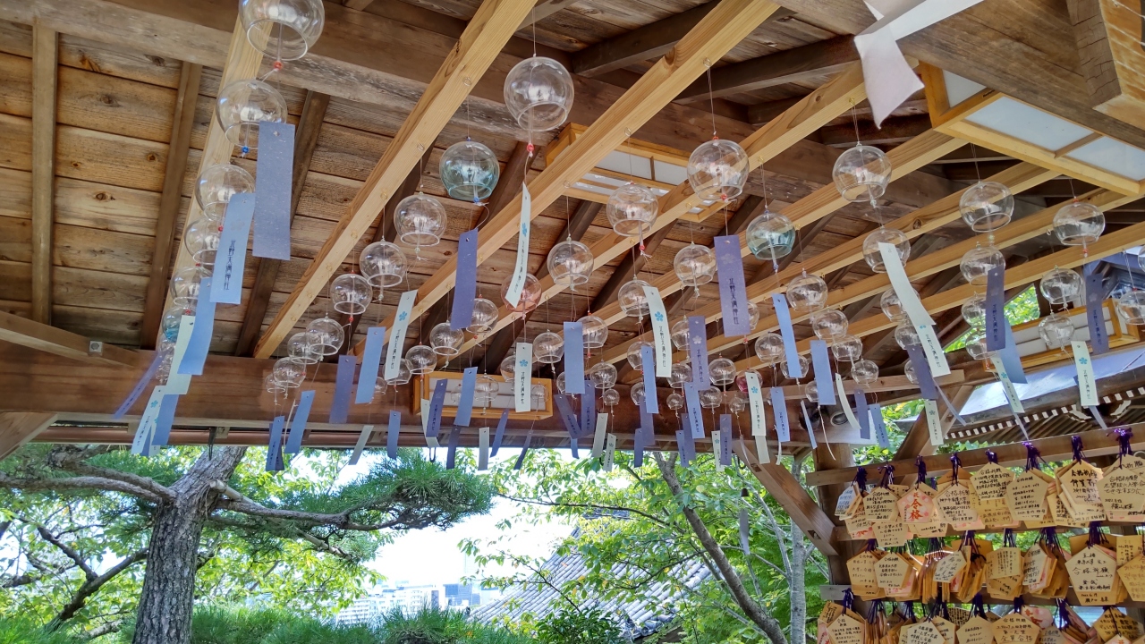 北野天満神社は、JR三ノ宮駅から徒歩20分のところに鎮座している学問の神様・菅原道真を祀る神社です。白い大きな鳥居をくぶり、急な階段の上に社殿等があります。この神社は、平清盛が1180年に京都・北野天満宮を勧請した歴史あるものです。8月に久しぶりに参拝しました。この神社の手水舎は、かない鯉と言われており、鯉のオブジェがありました。コロナの関係か水をかけることはNGでした。願掛け所には、多くの絵馬の奉納と共に夏らしく風鈴が飾られていました(写真参照)。涼しい音色を奏でていました。北野天天満神社は、見晴らしも良く、北野異人館街のお奨めのスポットの1つです。