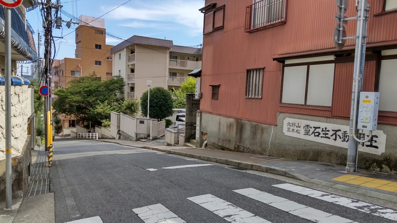 異人館が並ぶ北野町山本通りに高野山真言宗北野山三本松不動院があります。異人館街には不思議な寺院です。この不動院の横から北野坂下へと続く急な坂道が不動坂です。北野異人館街からJR三ノ宮へ向かう時に通りました。途中に近辺にある神戸ハリストス協会、一宮神社を巡りました。