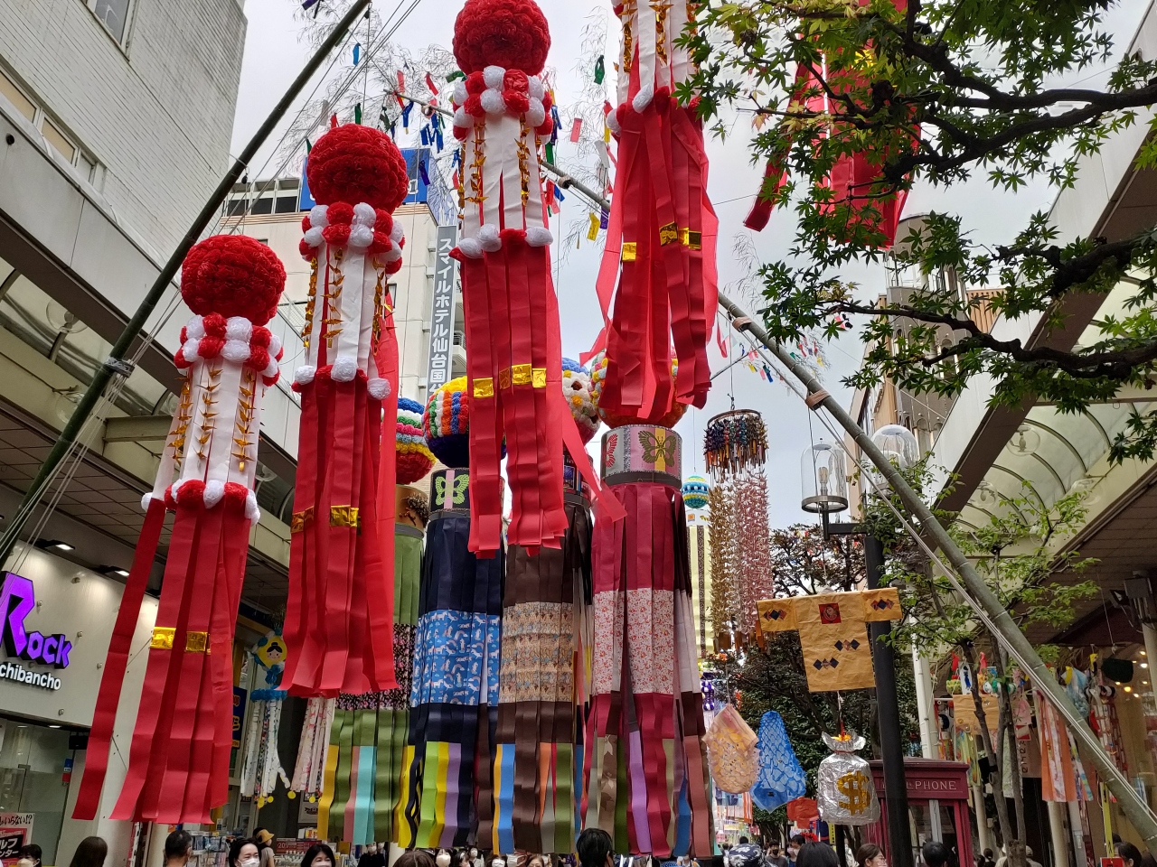 仙台の七夕祭りが行われるメインの商店街の一つで、仙台駅近くの名掛丁からクリスロード、マーブルロードと中央通りを来て、十字路で折れて一番町に入り、一番町四丁目商店街は一番北側に当たる場所です。