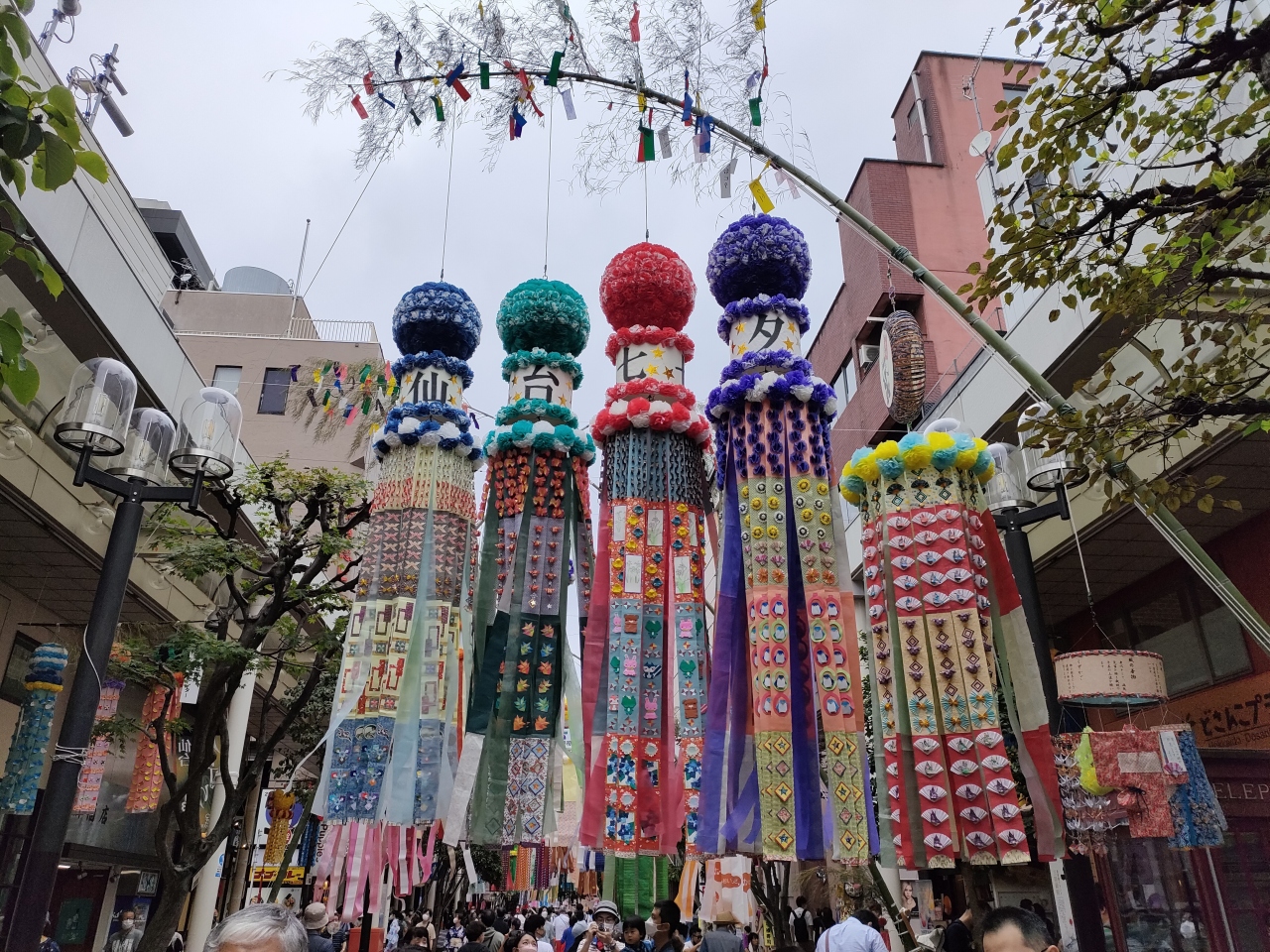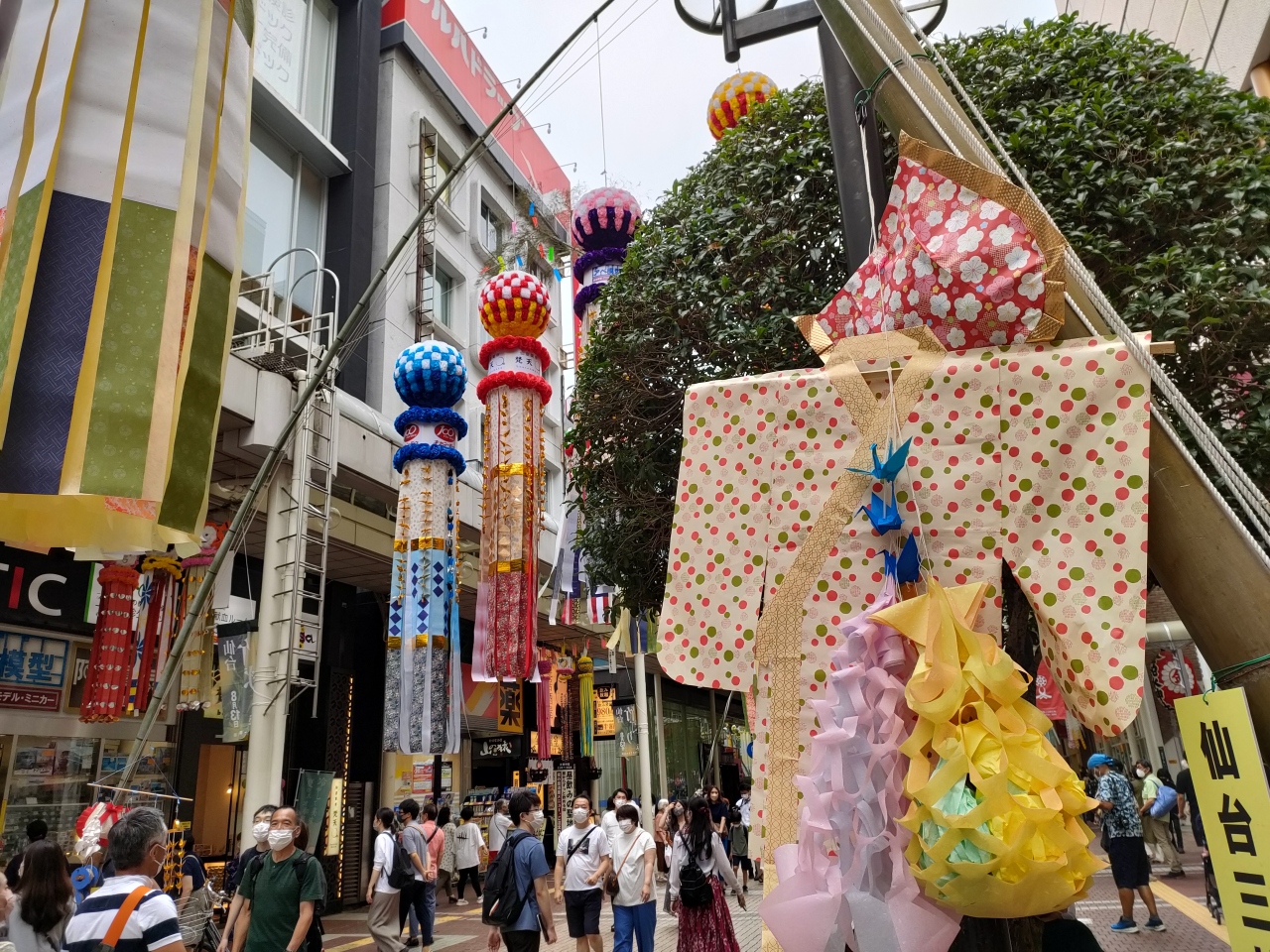 ここまで仙台駅から約15分(1km)。アーケードの屋根は途切れ、中央の車道上には屋根は無いですが、七夕飾りの吹き流しは、今までの天井に横に渡した竹から下がるものから、今度は沿道に立てた竹飾りになって、より風情のある雰囲気になっていました。