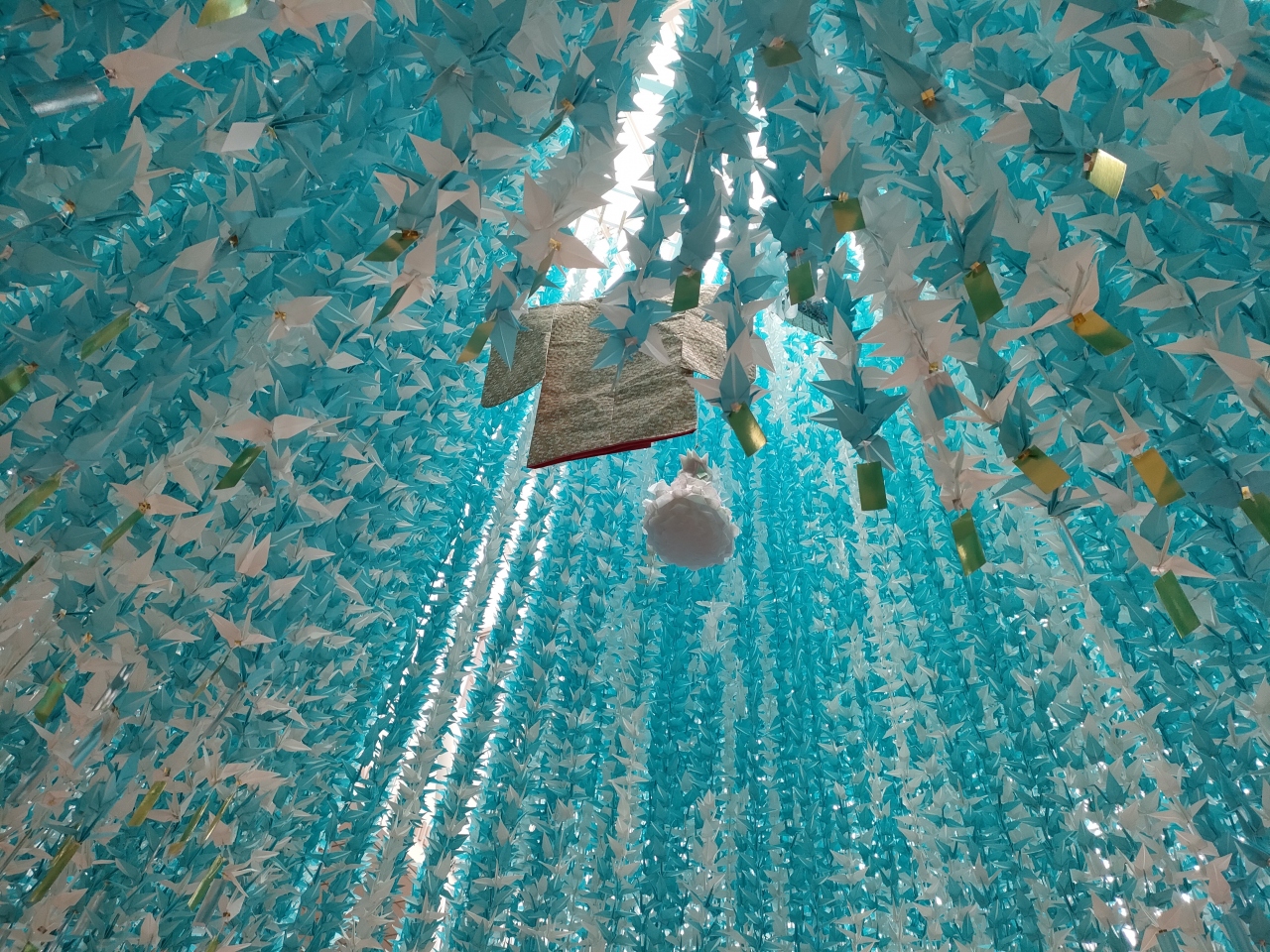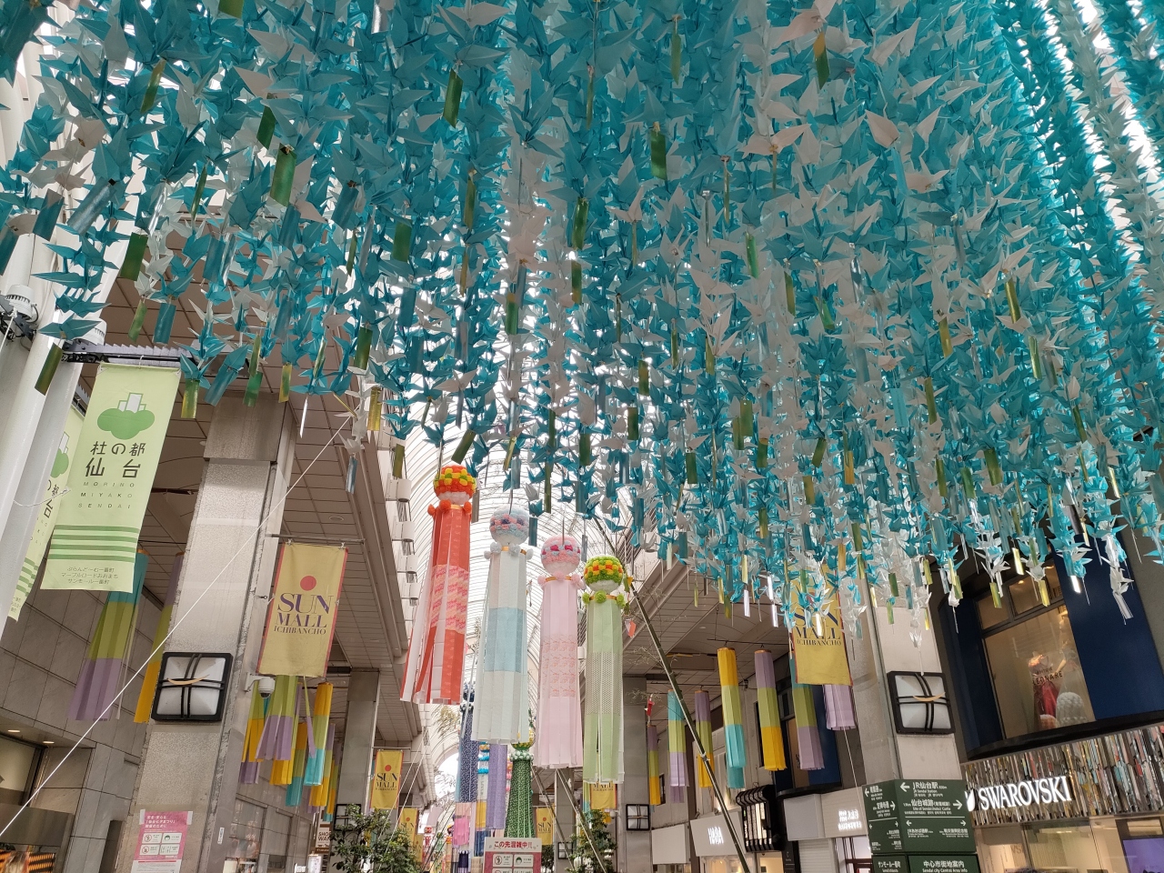 仙台駅前の名掛町から始まるサンモールと中央通りとの交差点のところには、何千、何万と下がった折り鶴からなる巨大な七夕飾りが下がっていて、圧巻でした。